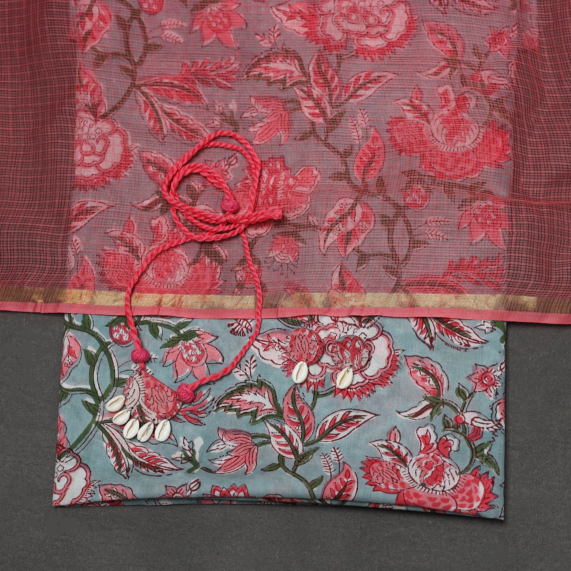 2pc unstitched dress material set features sanganeri hand block print kurta fabric from Rajasthan, known for its fine floral motifs. It is paired with a plain kota doria cotton dupatta, which is light and breathable for everyday comfort. The set also includes a handcrafted necklace and matching earrings.