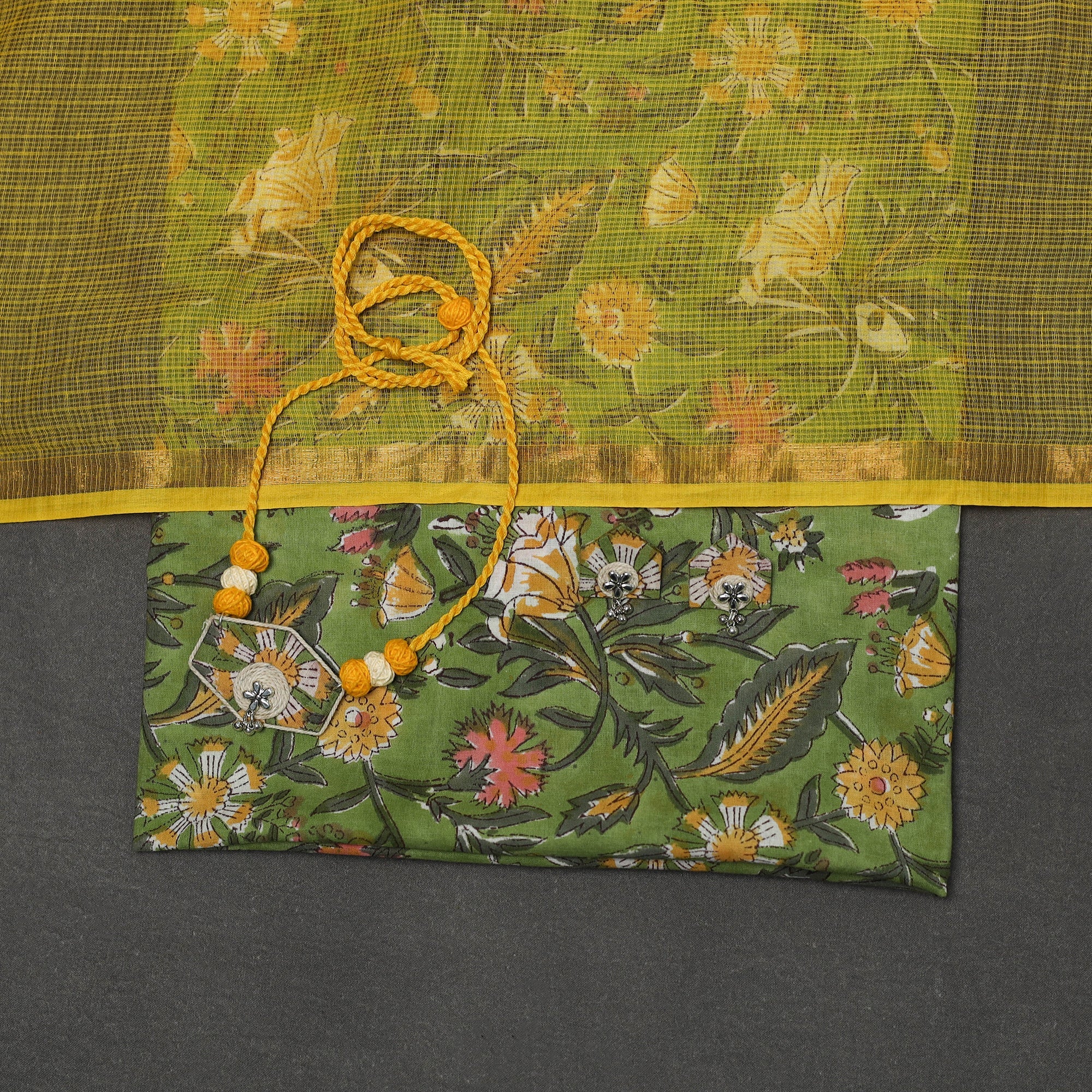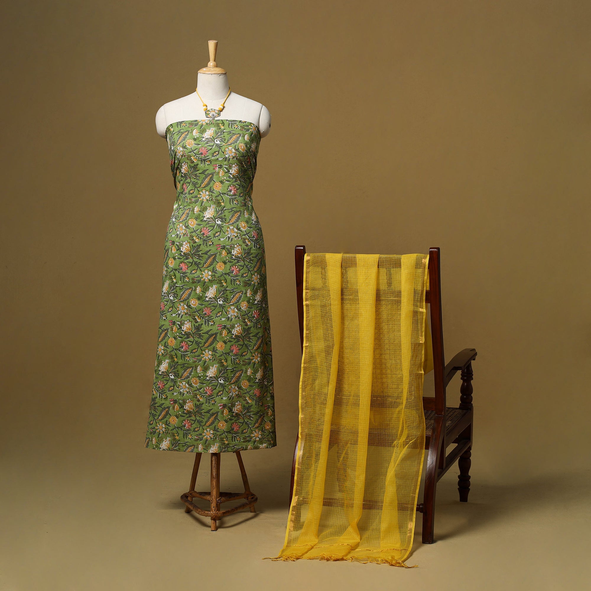 2pc unstitched dress material set features sanganeri hand block print kurta fabric from Rajasthan, known for its fine floral motifs. It is paired with a plain kota doria cotton dupatta, which is light and breathable for everyday comfort. The set also includes a handcrafted necklace and matching earrings.