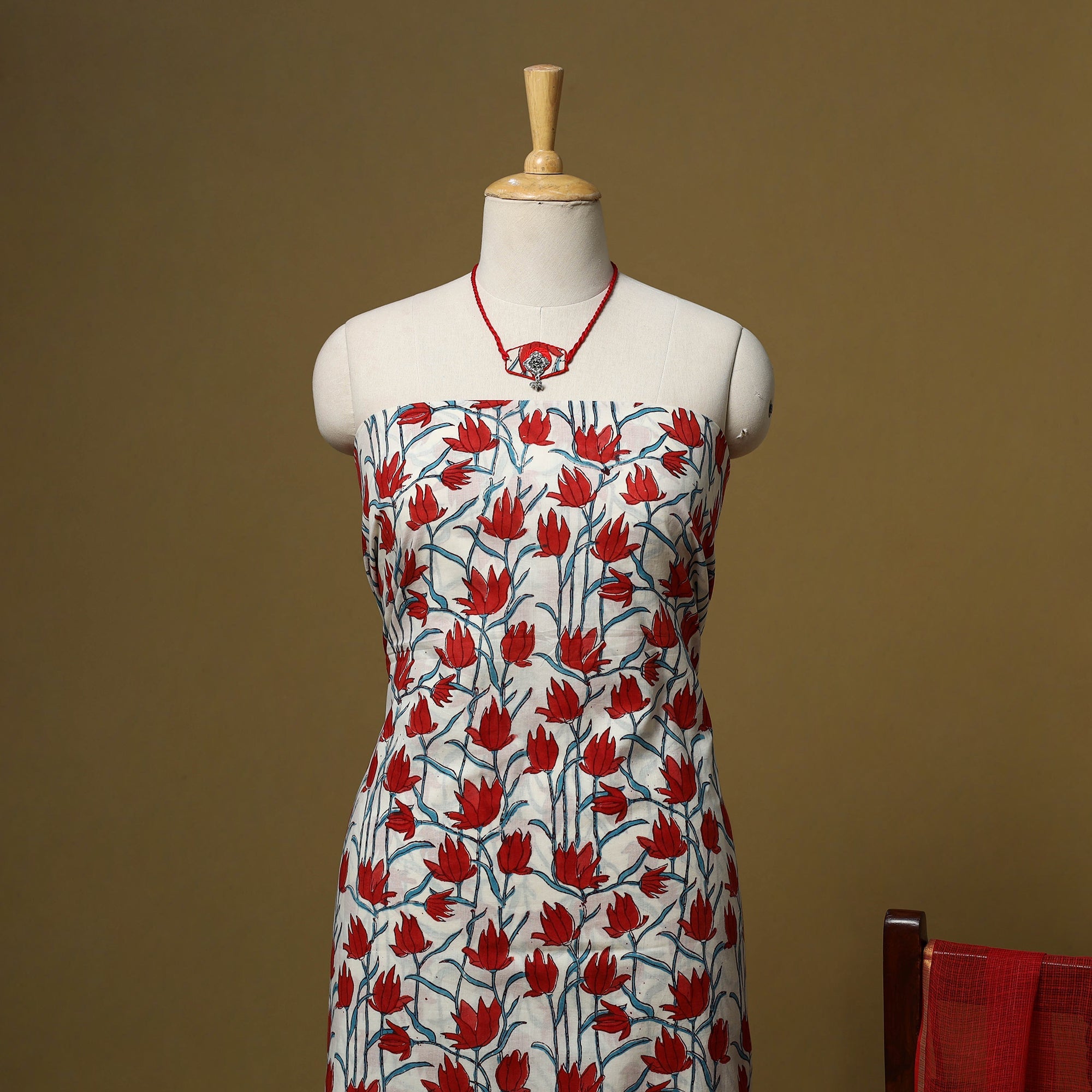 2pc unstitched dress material set features sanganeri hand block print kurta fabric from Rajasthan, known for its fine floral motifs. It is paired with a plain kota doria cotton dupatta, which is light and breathable for everyday comfort. The set also includes a handcrafted necklace and matching earrings.