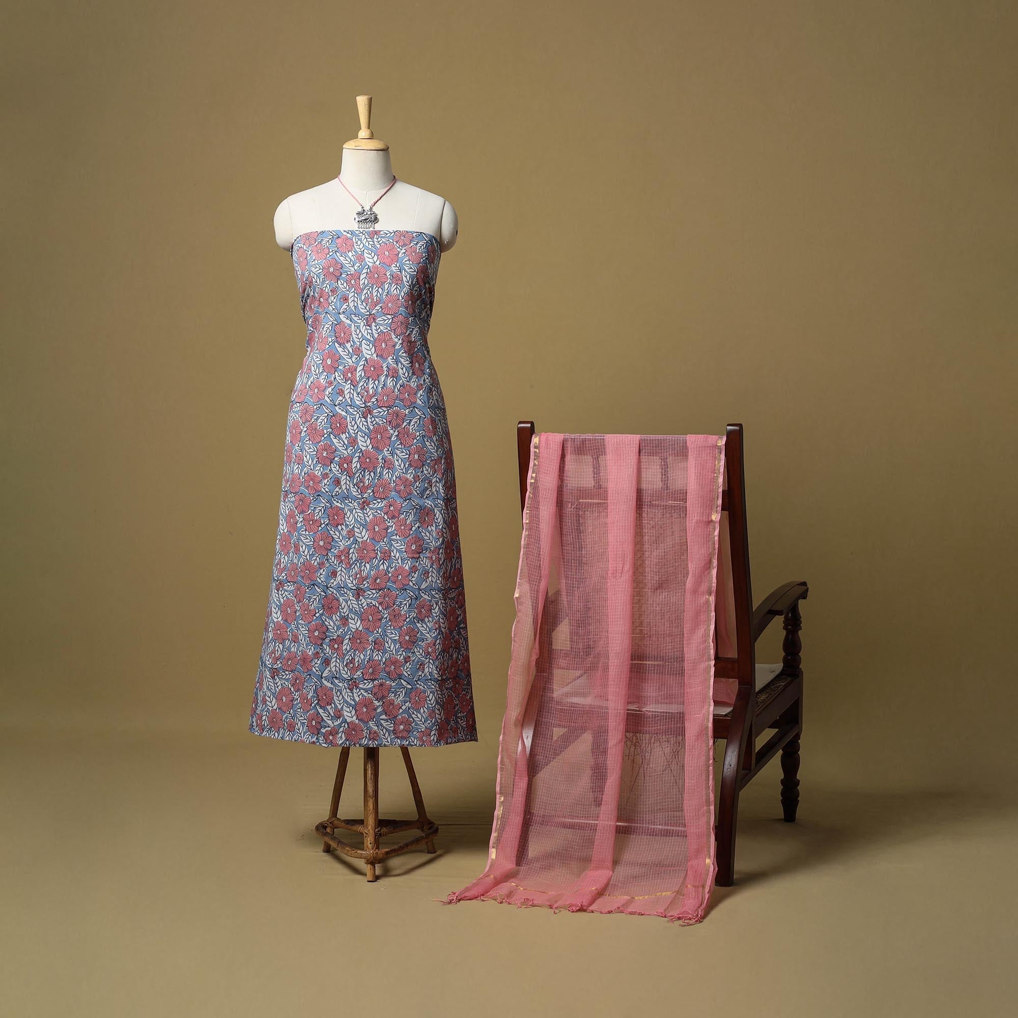 2pc unstitched dress material set features a sanganeri block print cotton kurta fabric, perfect for everyday elegance. It comes paired with a lightweight kota doria dupatta that adds soft texture and grace. Completing the set is a handcrafted necklace with matching earrings, making it a ready-to-style ensemble for effortless ethnic wear.