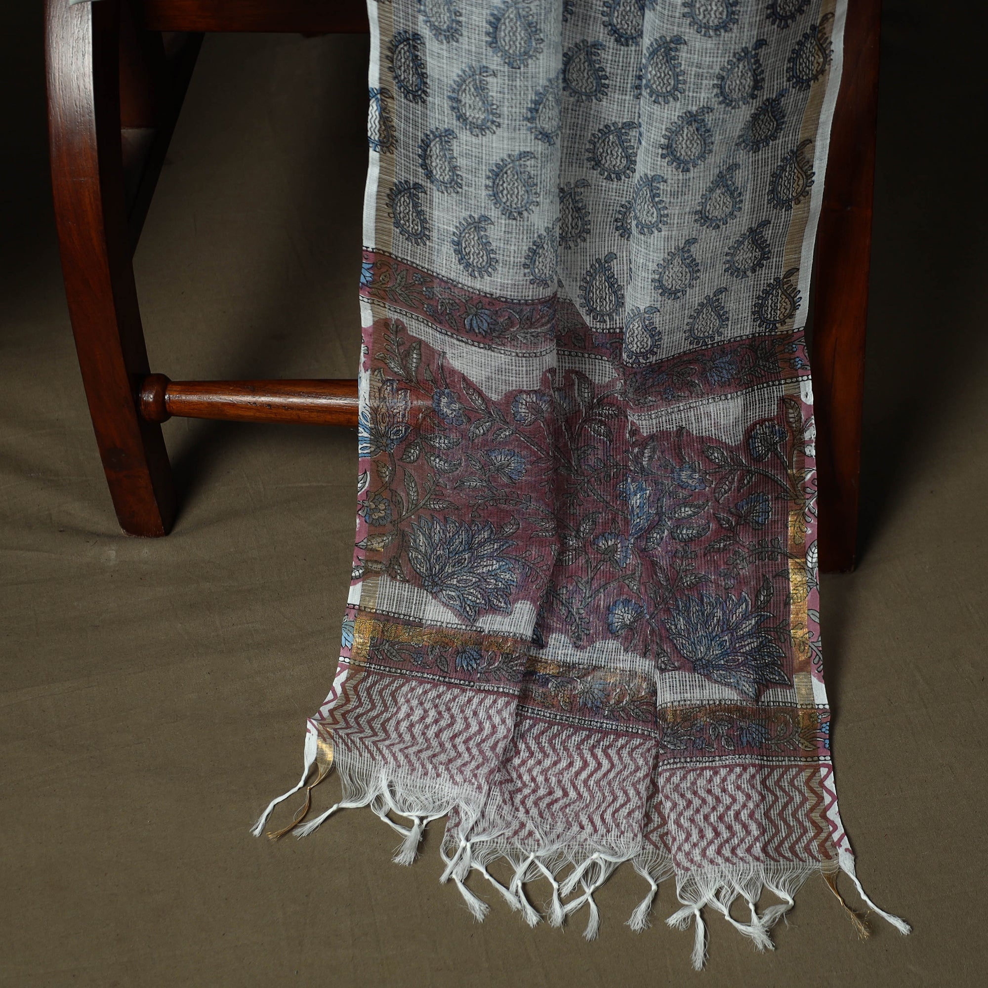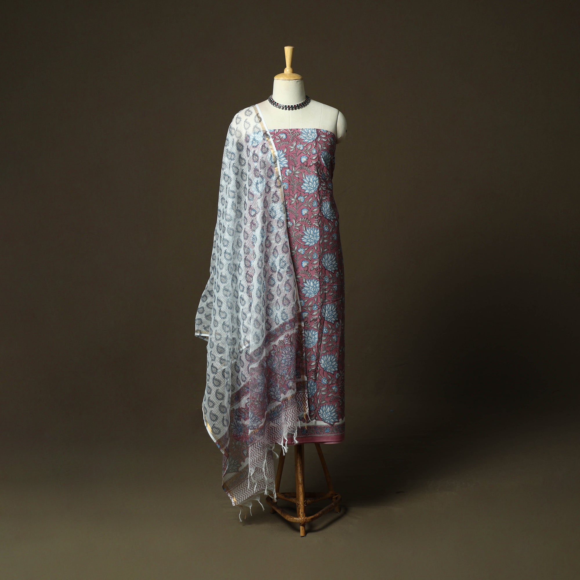 Hand block print sanganeri cotton 3pc unstitched dress material blends traditional artistry with everyday comfort. It is created using the traditional hand block printing technique of Sanganer, a historic town in the southern part of Jaipur, Rajasthan. Practised for over 500 years, this craft is carried forward by skilled artisans, with techniques passed down through generations. Fine patterns are produced using intricately hand-carved wooden blocks. The kurta and bottom fabrics are made from cotton. The dupatta is crafted in kota doria cotton. Kota Doria is an age-old Indian textile produced in the Kota district of Rajasthan. The doria, or threads, are finely interwoven to create signature check patterns. Its lightweight and sheer texture give it an exquisite grace and elegance of its own. This combination makes the set suitable for daily wear, workdays and gatherings.