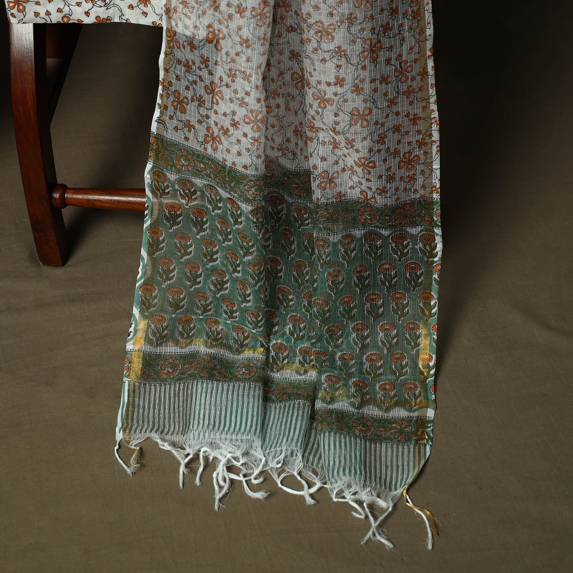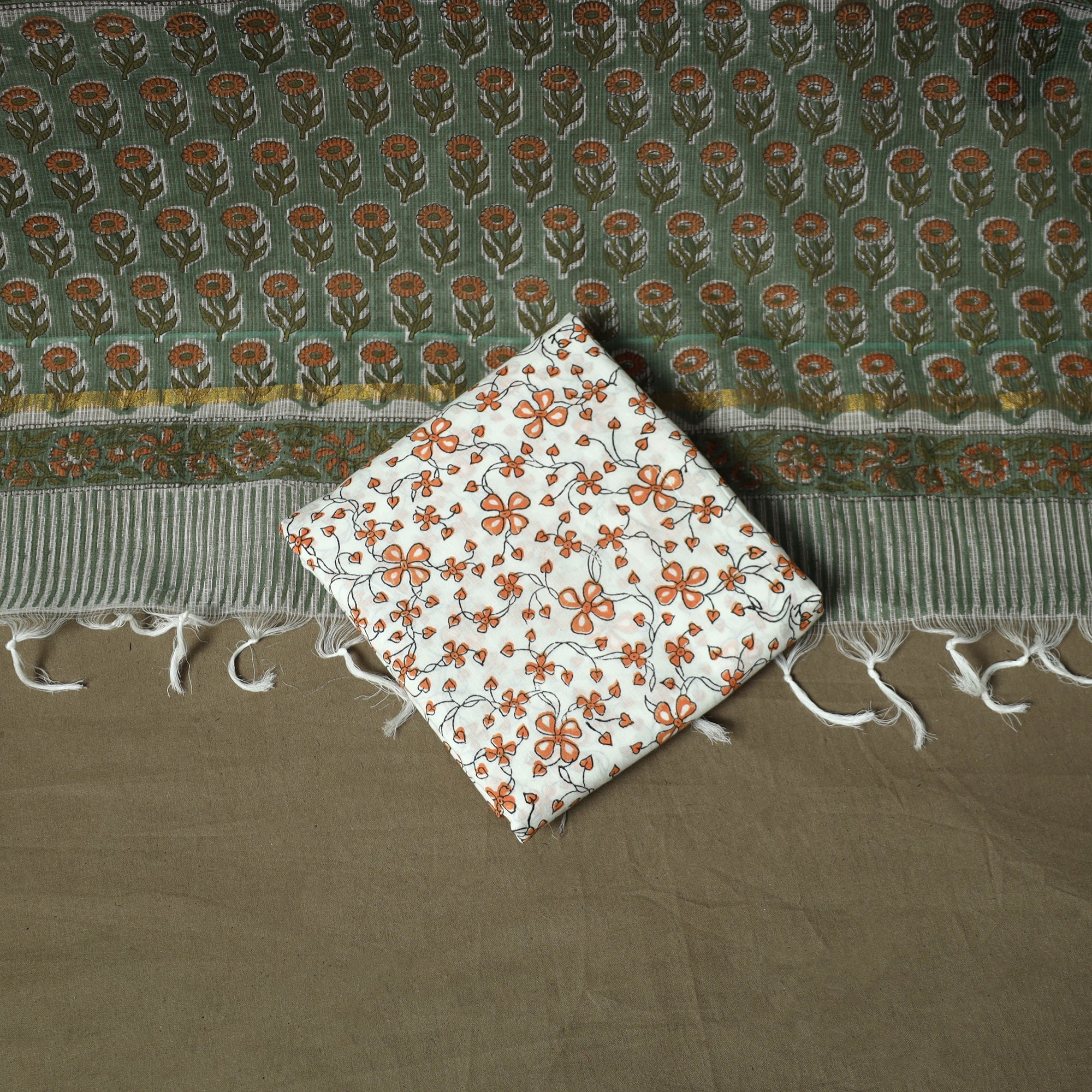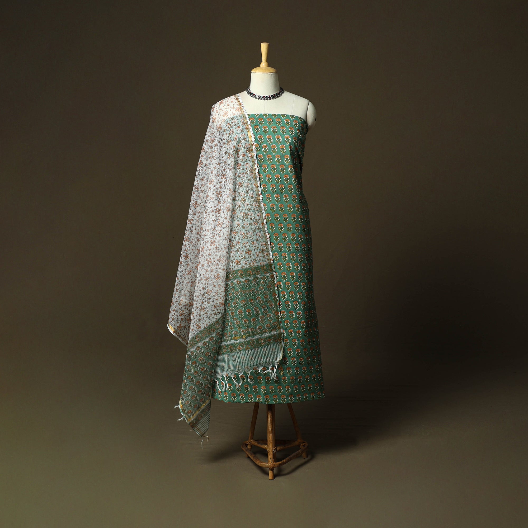 Hand block print sanganeri cotton 3pc unstitched dress material blends traditional artistry with everyday comfort. It is created using the traditional hand block printing technique of Sanganer, a historic town in the southern part of Jaipur, Rajasthan. Practised for over 500 years, this craft is carried forward by skilled artisans, with techniques passed down through generations. Fine patterns are produced using intricately hand-carved wooden blocks. The kurta and bottom fabrics are made from cotton. The dupatta is crafted in kota doria cotton. Kota Doria is an age-old Indian textile produced in the Kota district of Rajasthan. The doria, or threads, are finely interwoven to create signature check patterns. Its lightweight and sheer texture give it an exquisite grace and elegance of its own. This combination makes the set suitable for daily wear, workdays and gatherings.