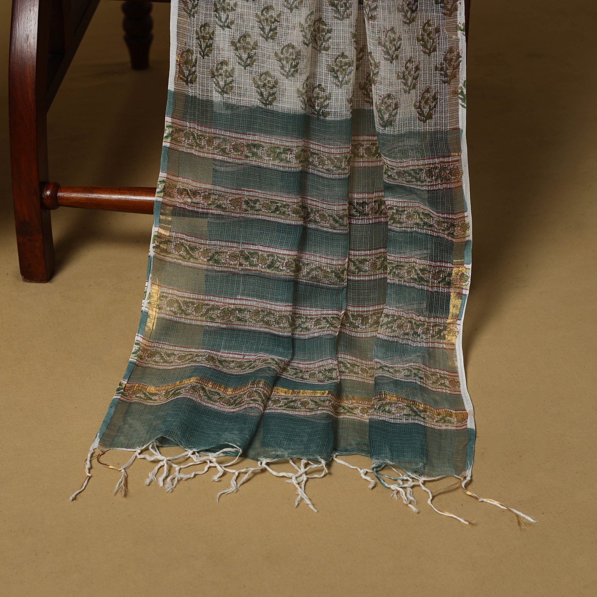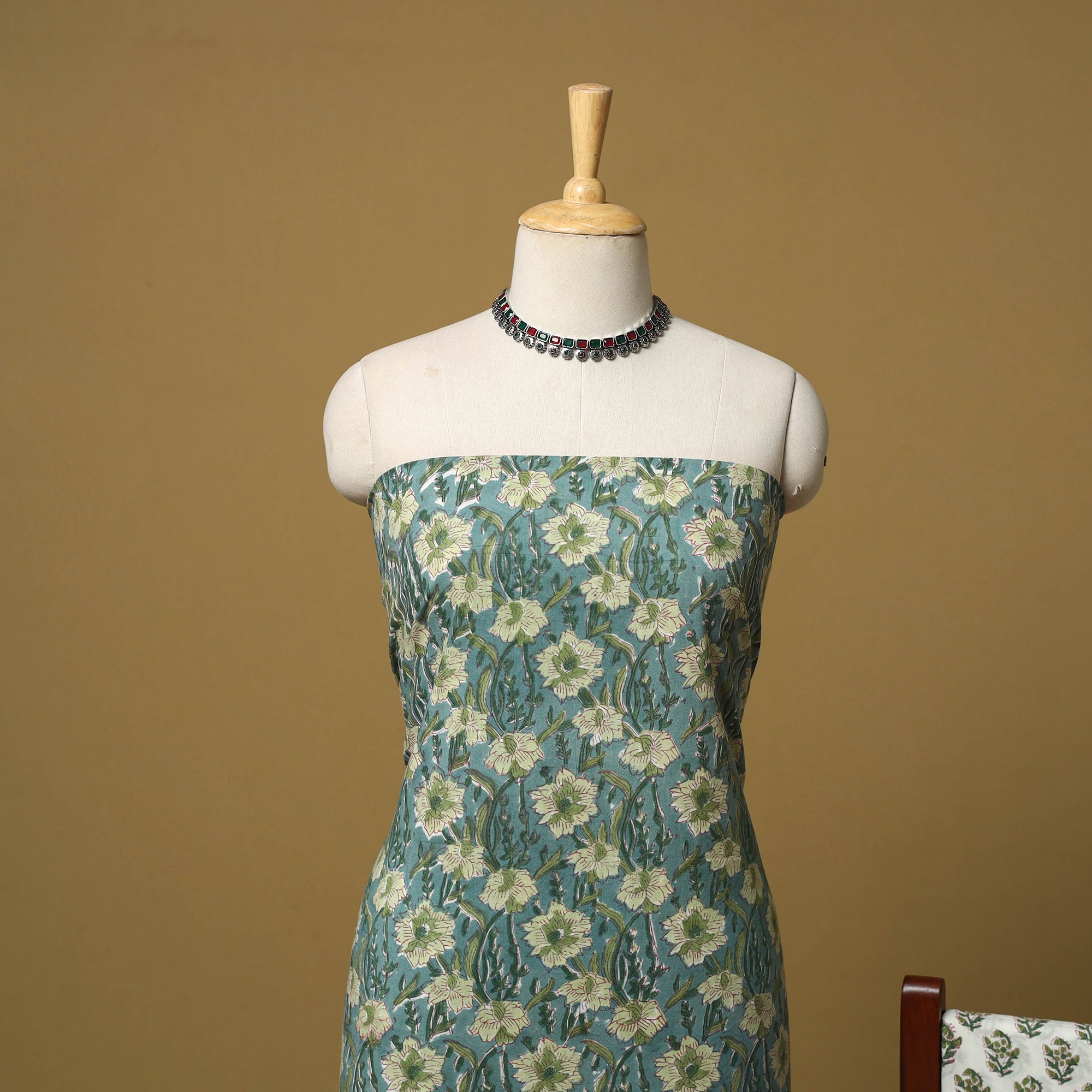 Sanganeri cotton 3pc unstitched dress material features traditional block printing by skilled artisans from Sanganer, Jaipur. The prints are created using bleed-free VAT dyes. The set includes fabric for the kurta and bottom, along with a lightweight kota doria dupatta finished with a zari border making it suitable for both festive occasions and everyday wear.