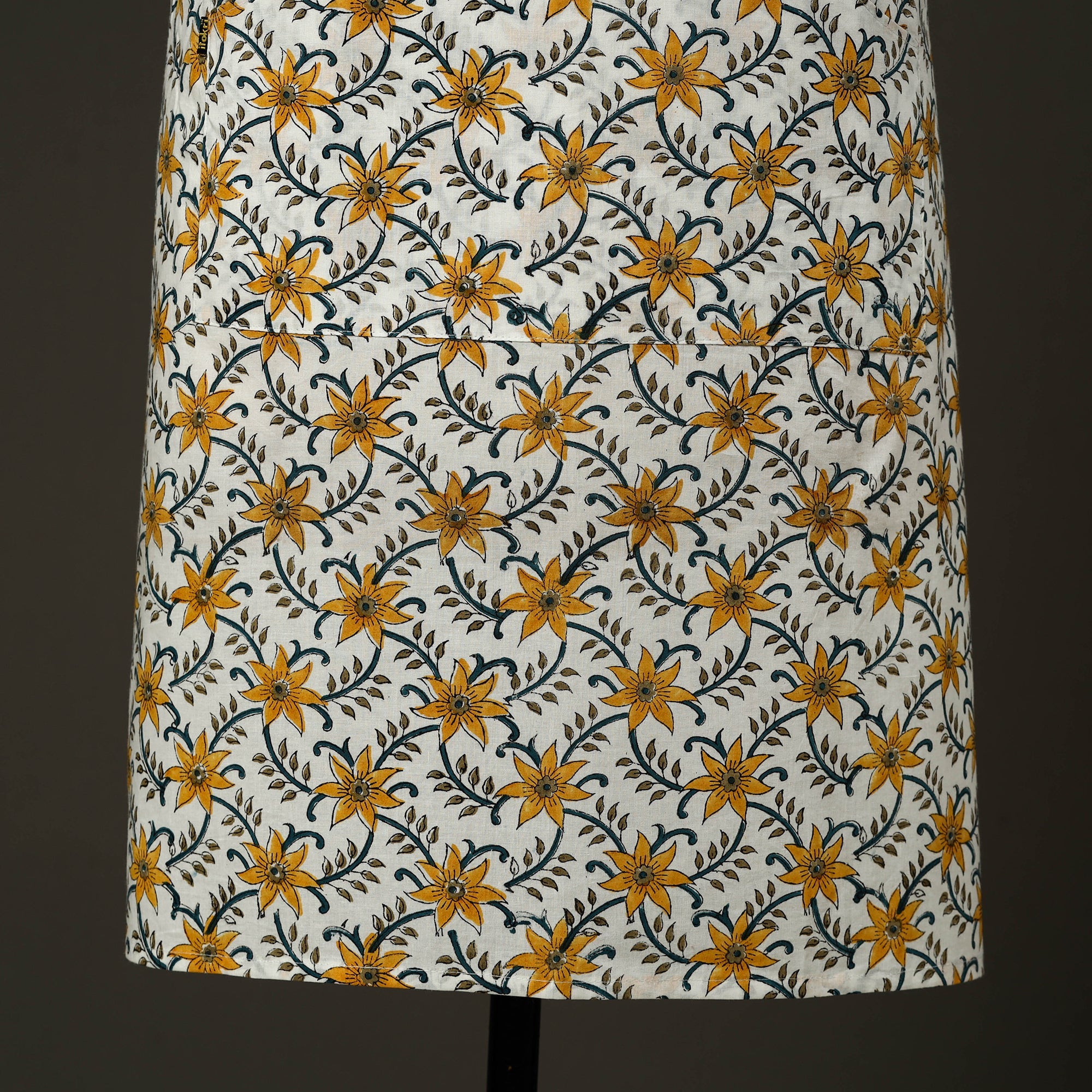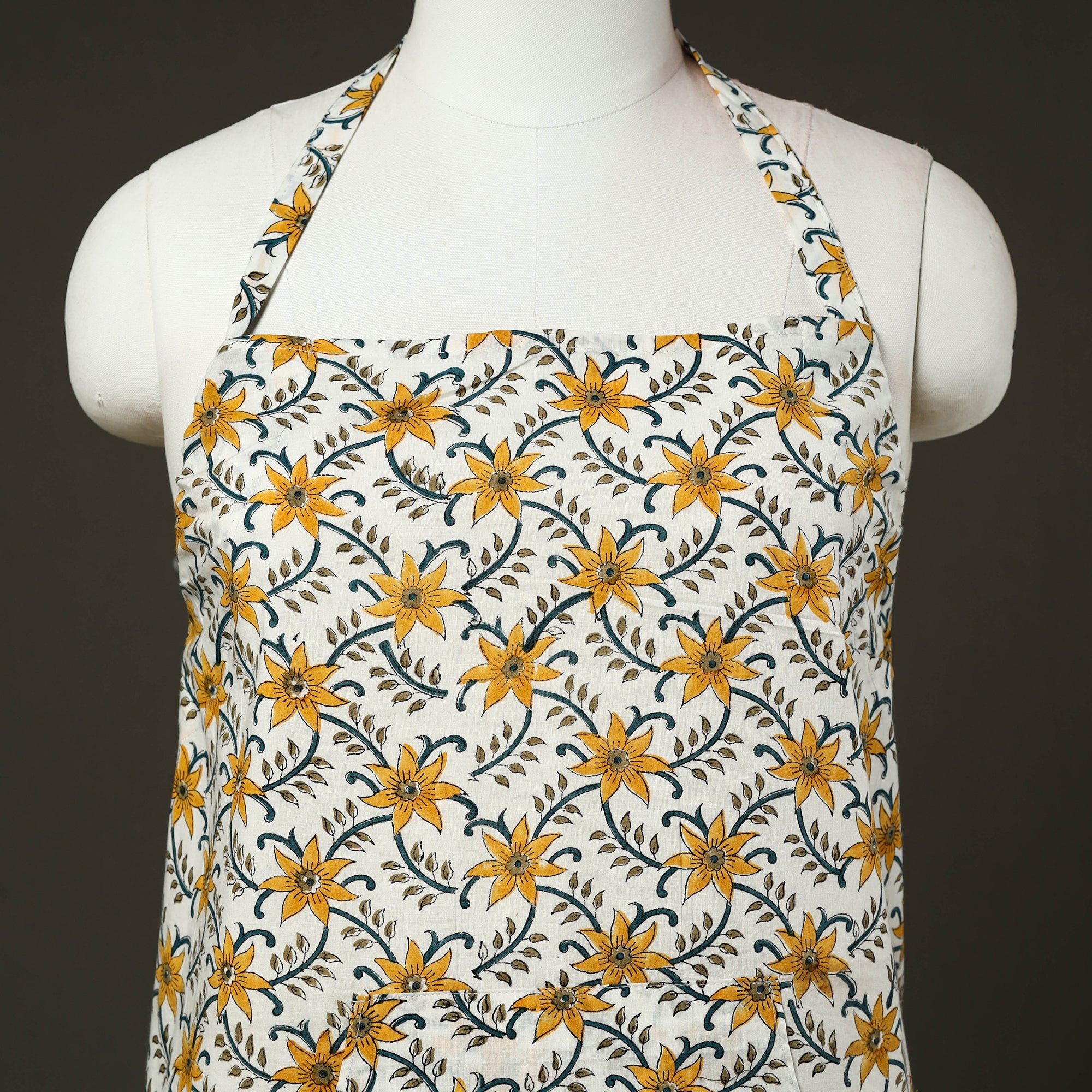 Upgrade your kitchen style with this white sanganeri block print cotton apron with pocket, featuring traditional hand-block printing techniques from Rajasthan. Made from soft, breathable cotton, it is lightweight. Designed to protect your clothing from splashes and spills, this handmade kitchen apron offers an adjustable neck strap and a front pocket for added convenience, making it ideal for daily cooking and baking.
