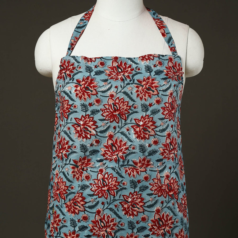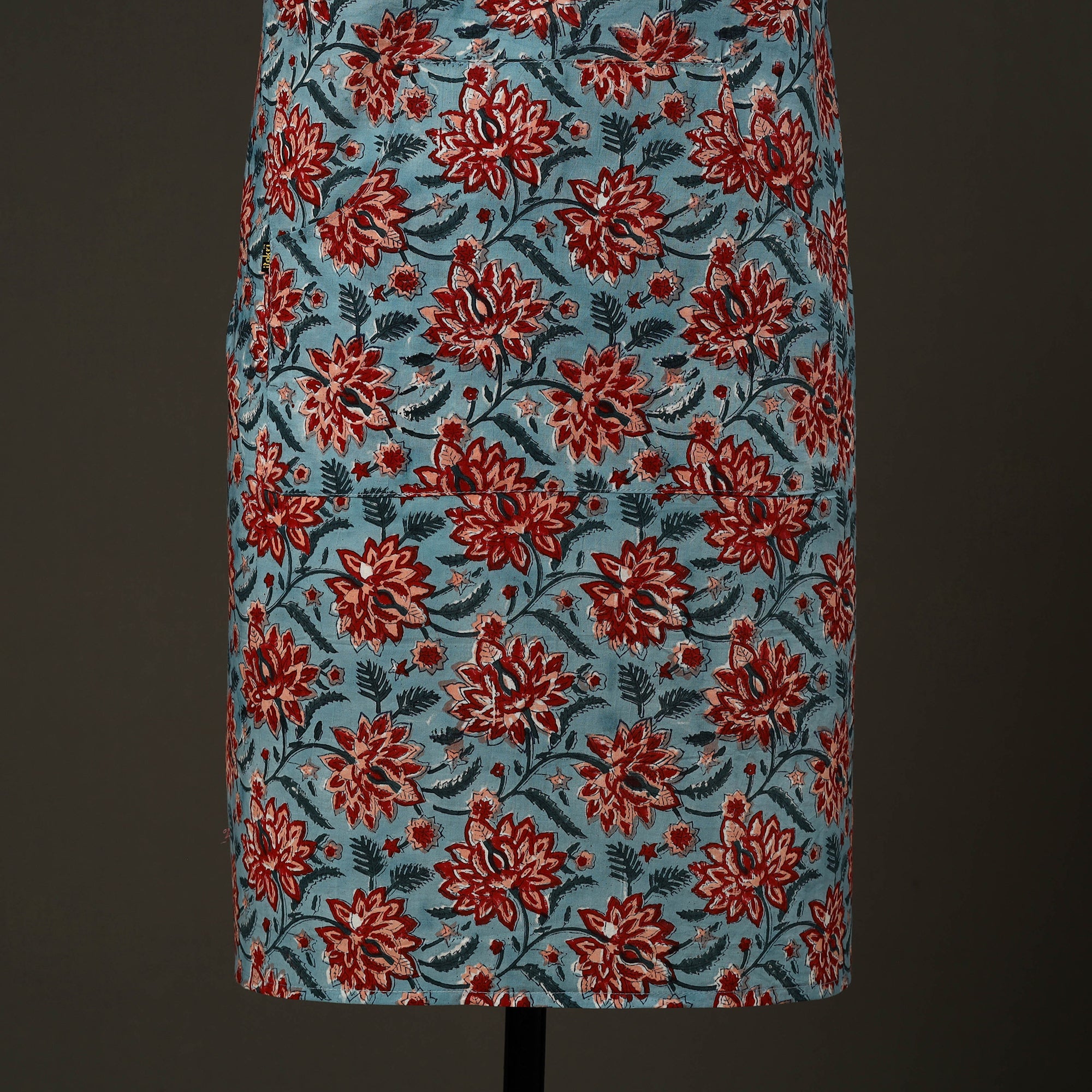 Upgrade your kitchen style with this sanganeri block print cotton apron with pocket, featuring traditional hand-block printing techniques from Rajasthan. Made from soft, breathable cotton, it is lightweight. Designed to protect your clothing from splashes and spills, this handmade kitchen apron offers an adjustable neck strap and a front pocket for added convenience, making it ideal for daily cooking and baking.