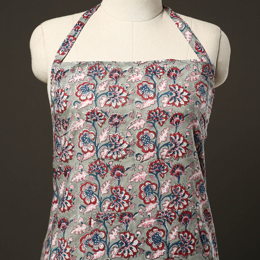 Elevate your kitchen style with this grey Sanganeri block print cotton apron. It features breathable cotton, an adjustable neck strap, and a handy front pocket. Perfect for home chefs and bakers. Lightweight and functional, it keeps you protected from spills with artisanal charm.