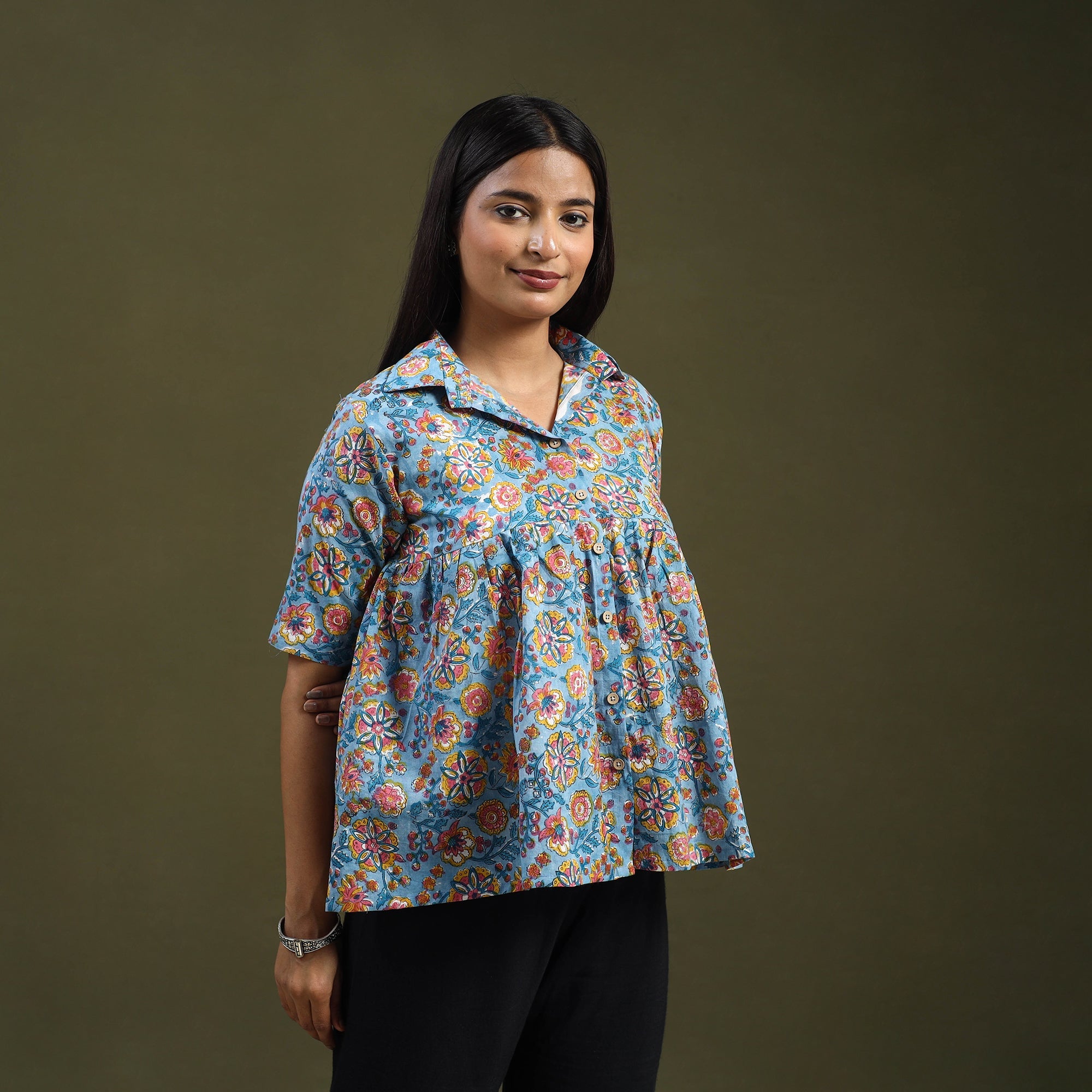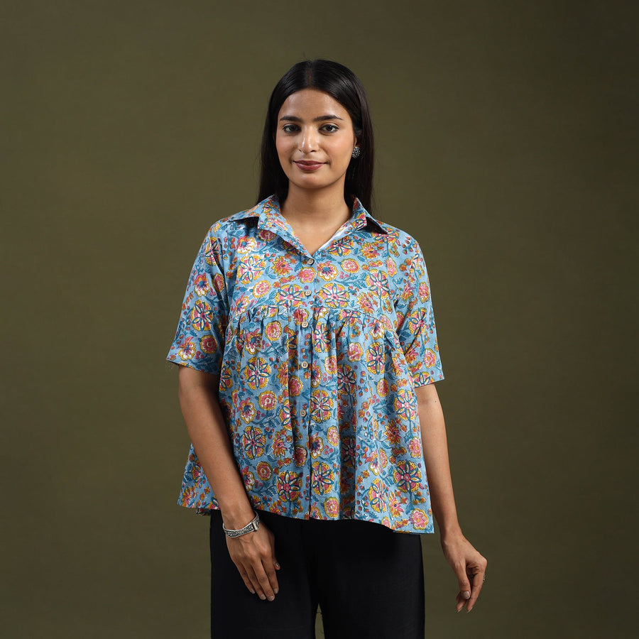 Infuse ethnic charm into your wardrobe with this blue sanganeri block print cotton crop top. Designed using heritage techniques, it features a stylish front button placket. The soft, airy cotton fabric ensures you stay cool and relaxed during outings or festivals. Its detailed patterns and smart fit add a refreshing touch to modern fashion.
