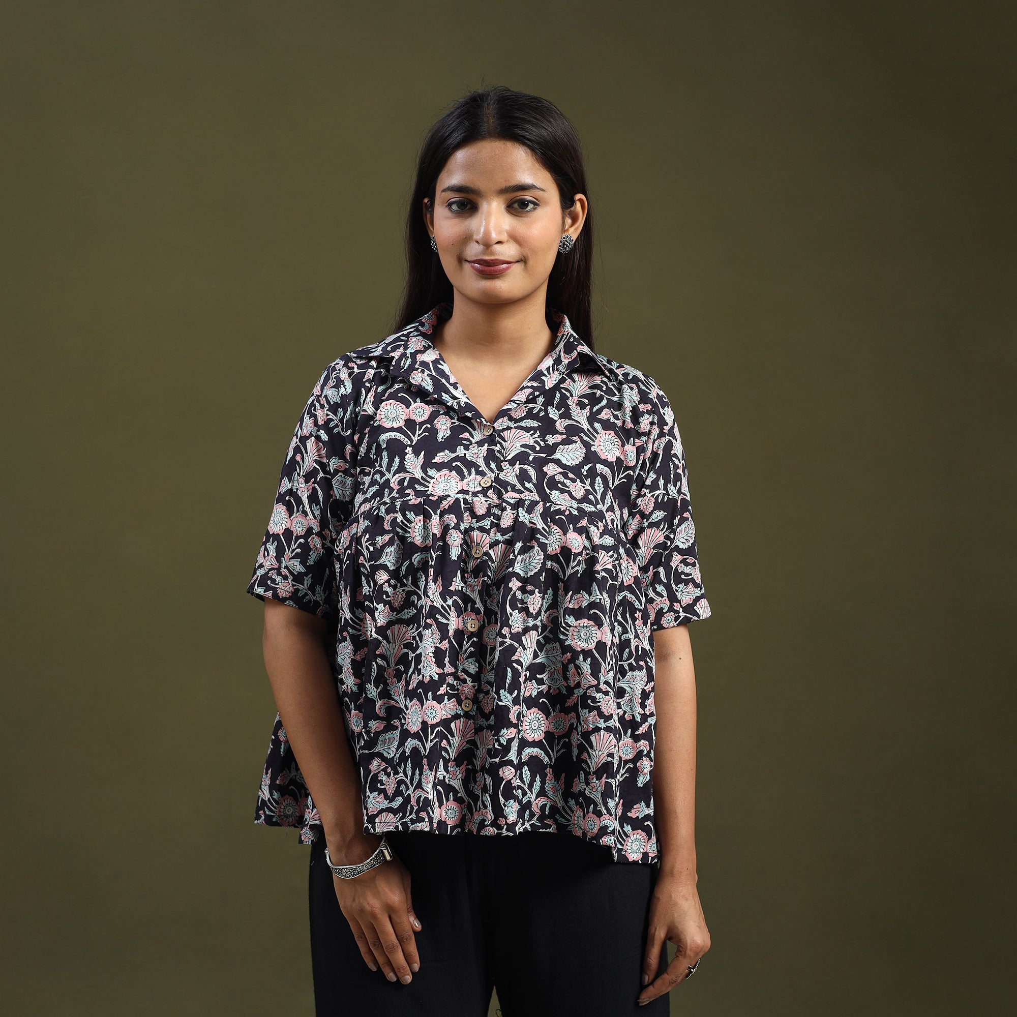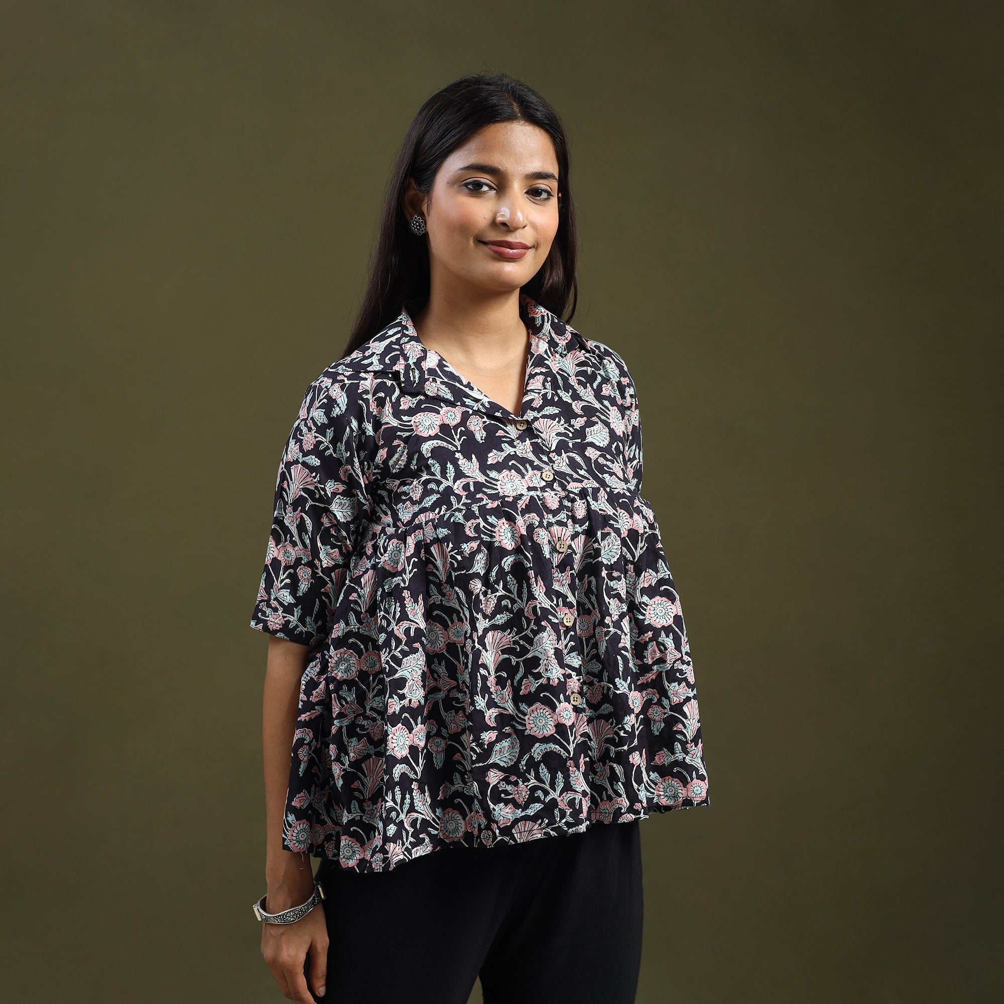 Infuse ethnic charm into your wardrobe with this black sanganeri block print cotton crop top. Designed using heritage techniques, it features a stylish front button placket. The soft, airy cotton fabric ensures you stay cool and relaxed during outings or festivals. Its detailed patterns and smart fit add a refreshing touch to modern fashion.