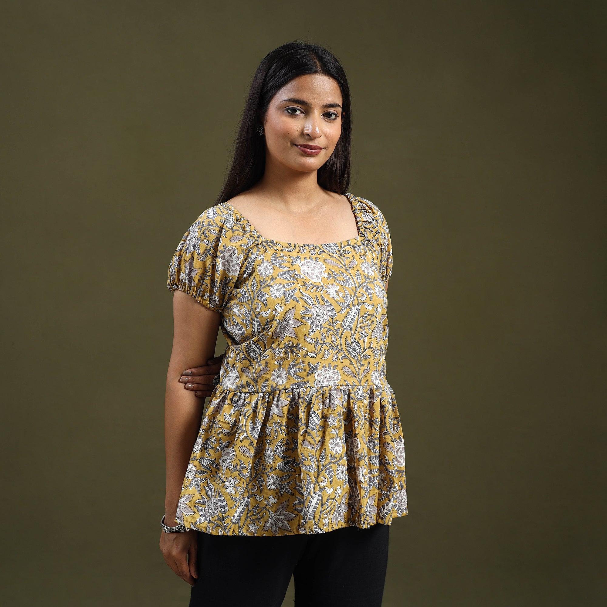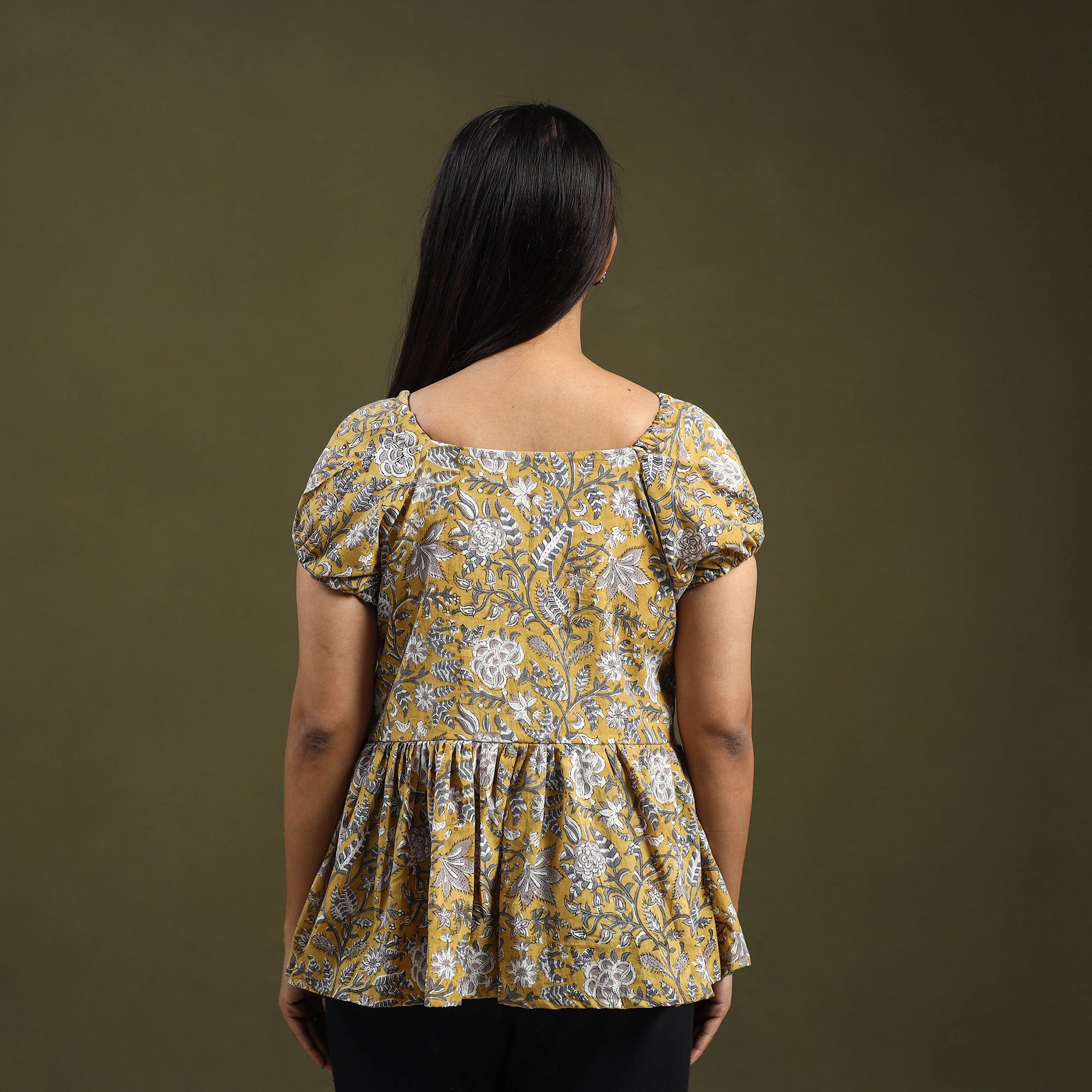 Elevate your everyday look with this beautifully crafted yellow sanganeri block print cotton top. Made from soft, airy cotton using traditional methods, it offers unmatched comfort. Perfect for casual meetups or festive gatherings, this crop top seamlessly fuses ethnic charm with a trendy touch.