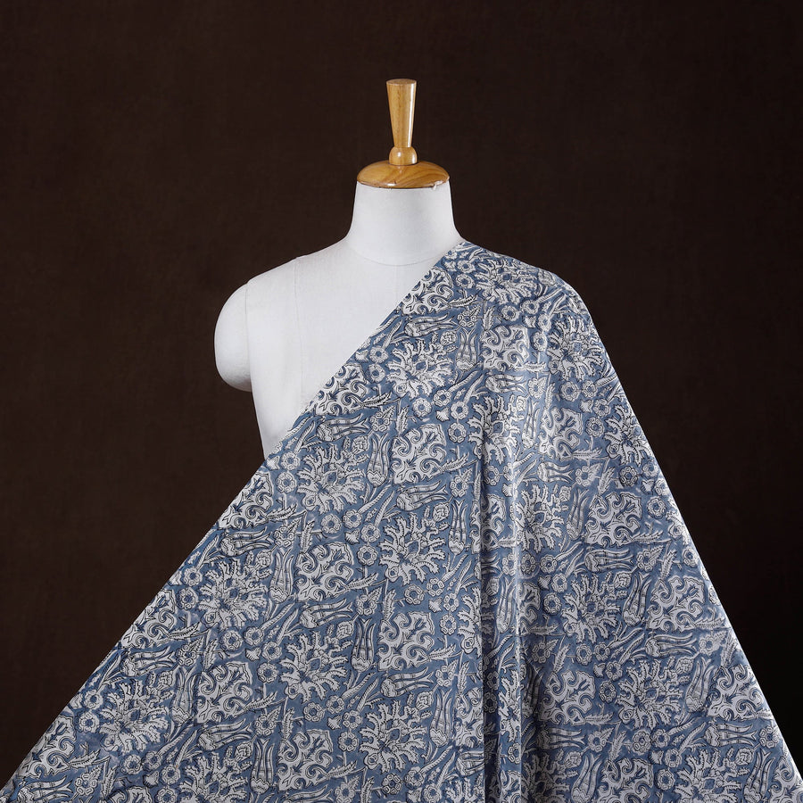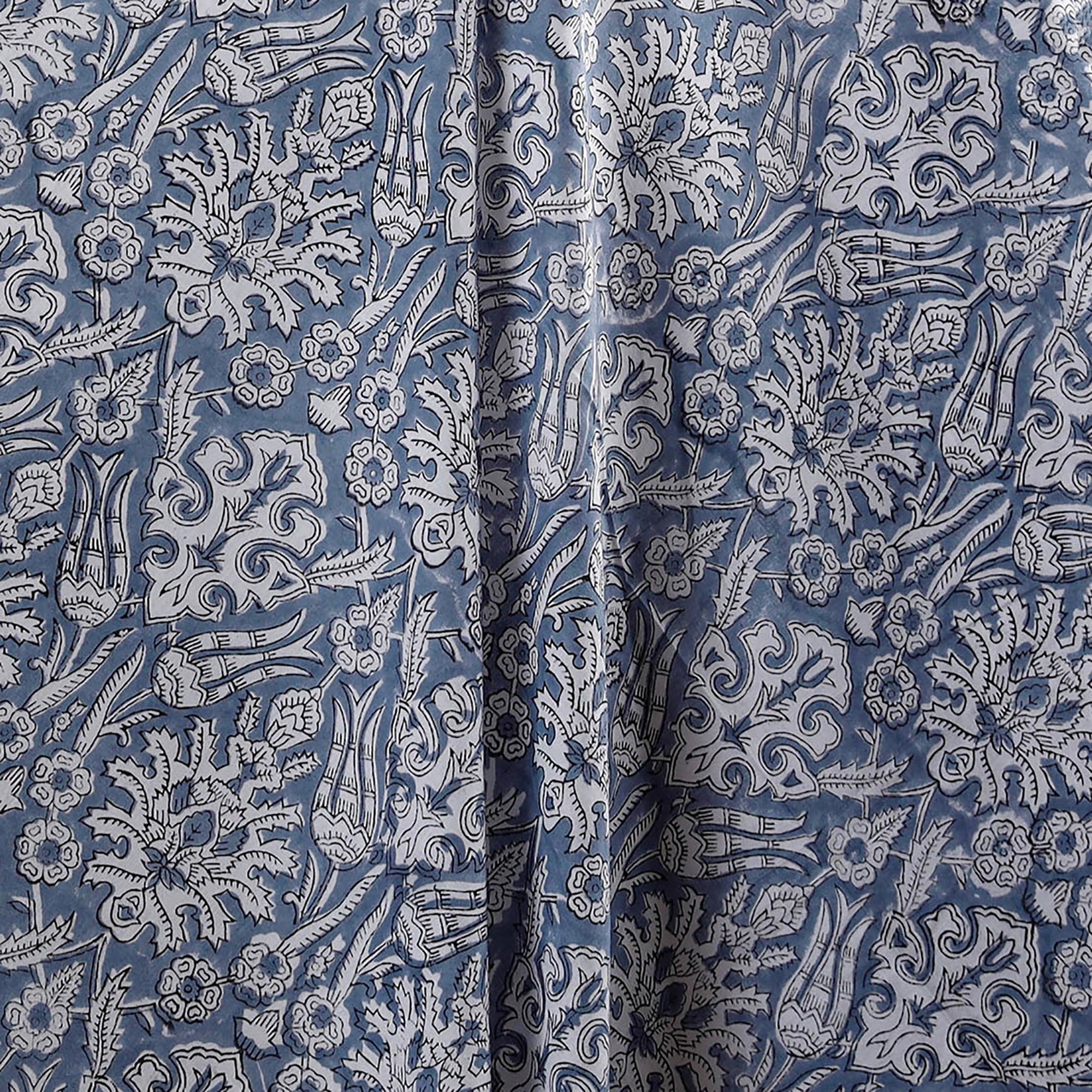 Blue sanganeri cotton fabric, printed using hand block techniques by artisans in Sanganer, Jaipur, Rajasthan, showcases delicate floral patterns created with traditional hand-carved wooden blocks and bleed-free VAT dyes. The breathable, lightweight cotton is ideal for making kurtas, dresses, tunics, or home decor items like cushions and curtains.