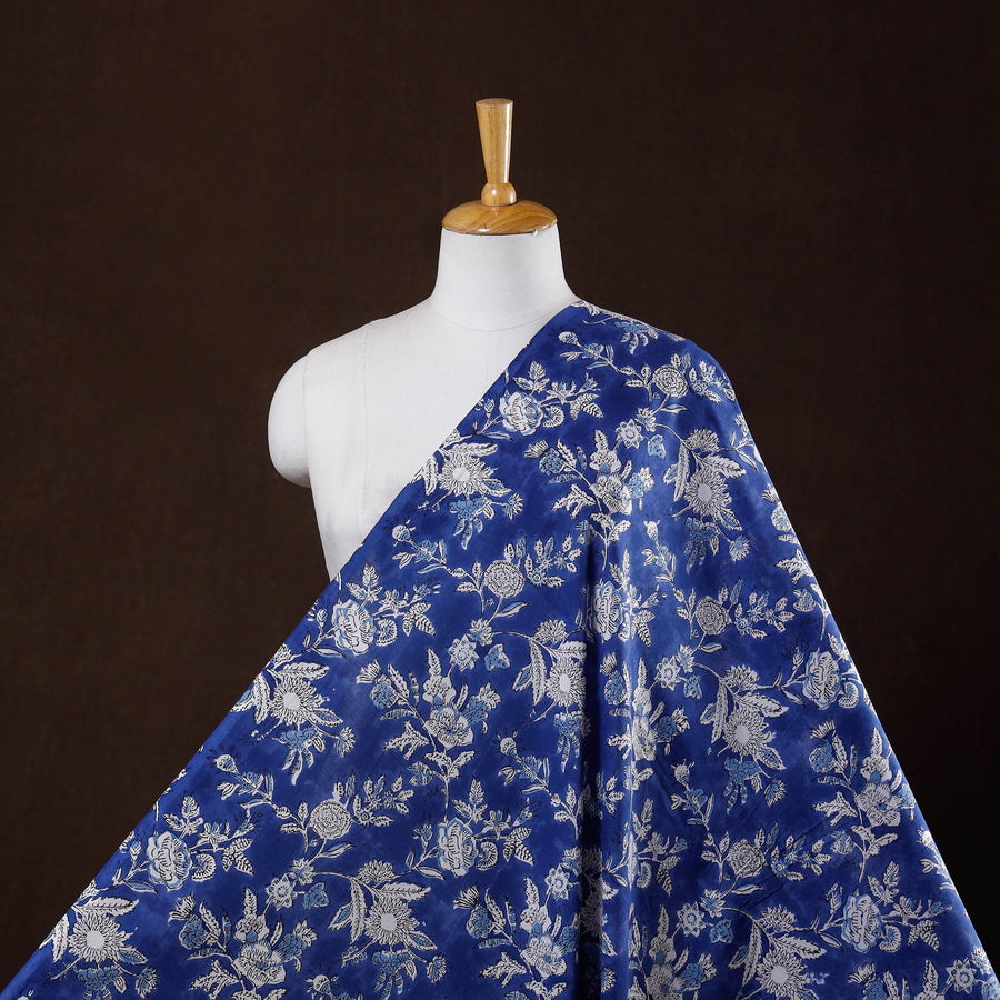 Blue sanganeri cotton fabric, printed using hand block techniques by artisans in Sanganer, Jaipur, Rajasthan, showcases delicate floral patterns created with traditional hand-carved wooden blocks and bleed-free VAT dyes. The breathable, lightweight cotton is ideal for making kurtas, dresses, tunics, or home decor items like cushions and curtains.