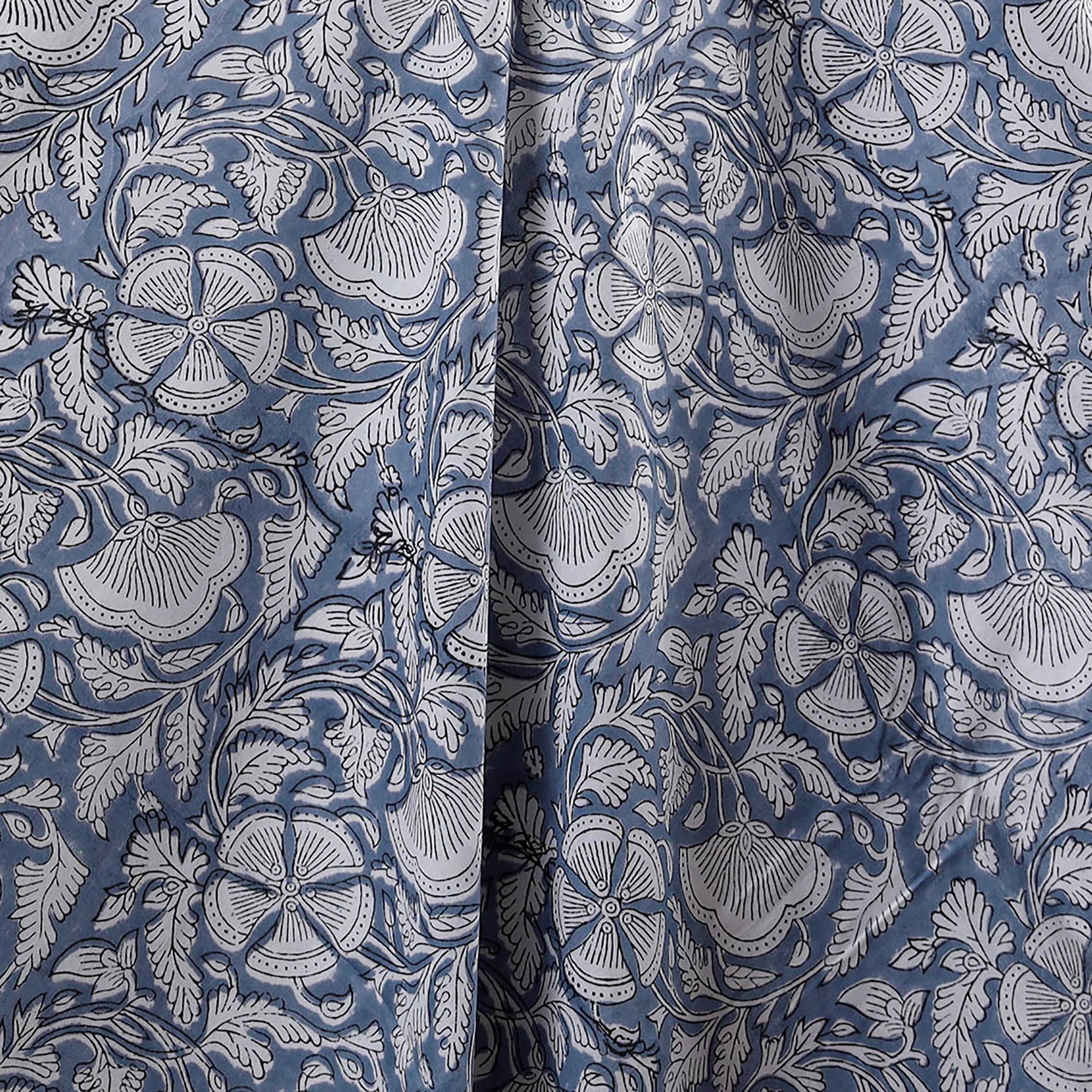 Blue sanganeri cotton fabric, printed using hand block techniques by artisans in Sanganer, Jaipur, Rajasthan, showcases delicate floral patterns created with traditional hand-carved wooden blocks and bleed-free VAT dyes. The breathable, lightweight cotton is ideal for making kurtas, dresses, tunics, or home decor items like cushions and curtains.