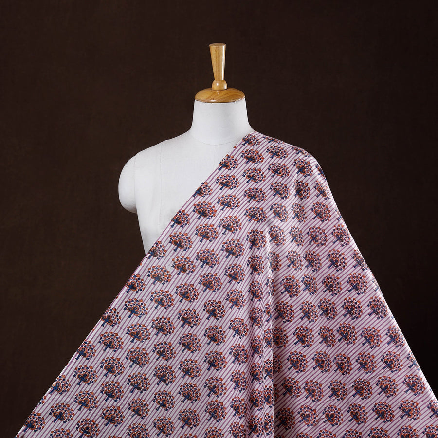 Pink sanganeri cotton fabric, printed using hand block techniques by artisans in Sanganer, Jaipur, Rajasthan, showcases delicate floral patterns created with traditional hand-carved wooden blocks and bleed-free VAT dyes. The breathable, lightweight cotton is ideal for making kurtas, dresses, tunics, or home decor items like cushions and curtains.