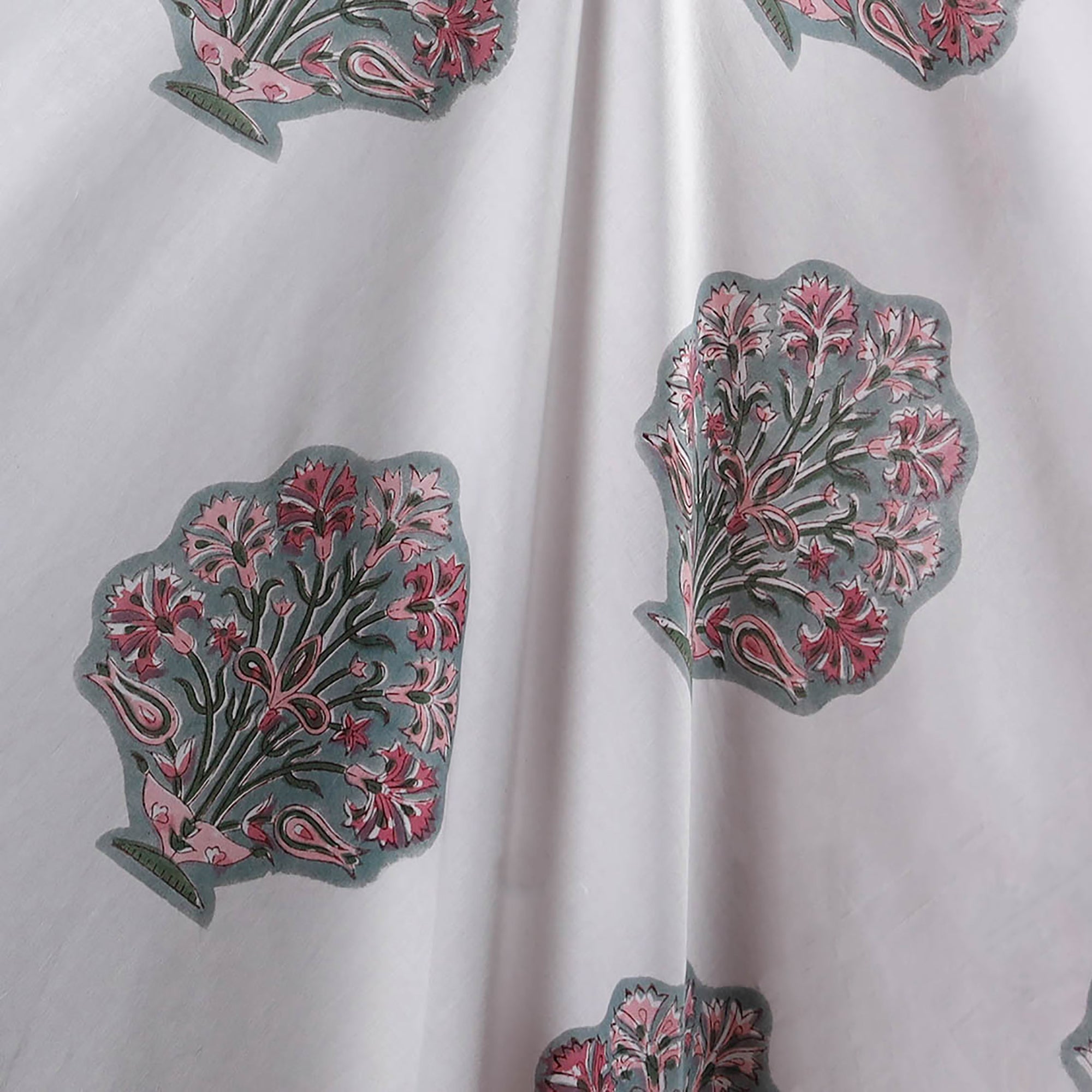 White sanganeri cotton fabric, printed using hand block techniques by artisans in Sanganer, Jaipur, Rajasthan, showcases delicate floral patterns created with traditional hand-carved wooden blocks and bleed-free VAT dyes. The breathable, lightweight cotton is ideal for making kurtas, dresses, tunics, or home decor items like cushions and curtains.