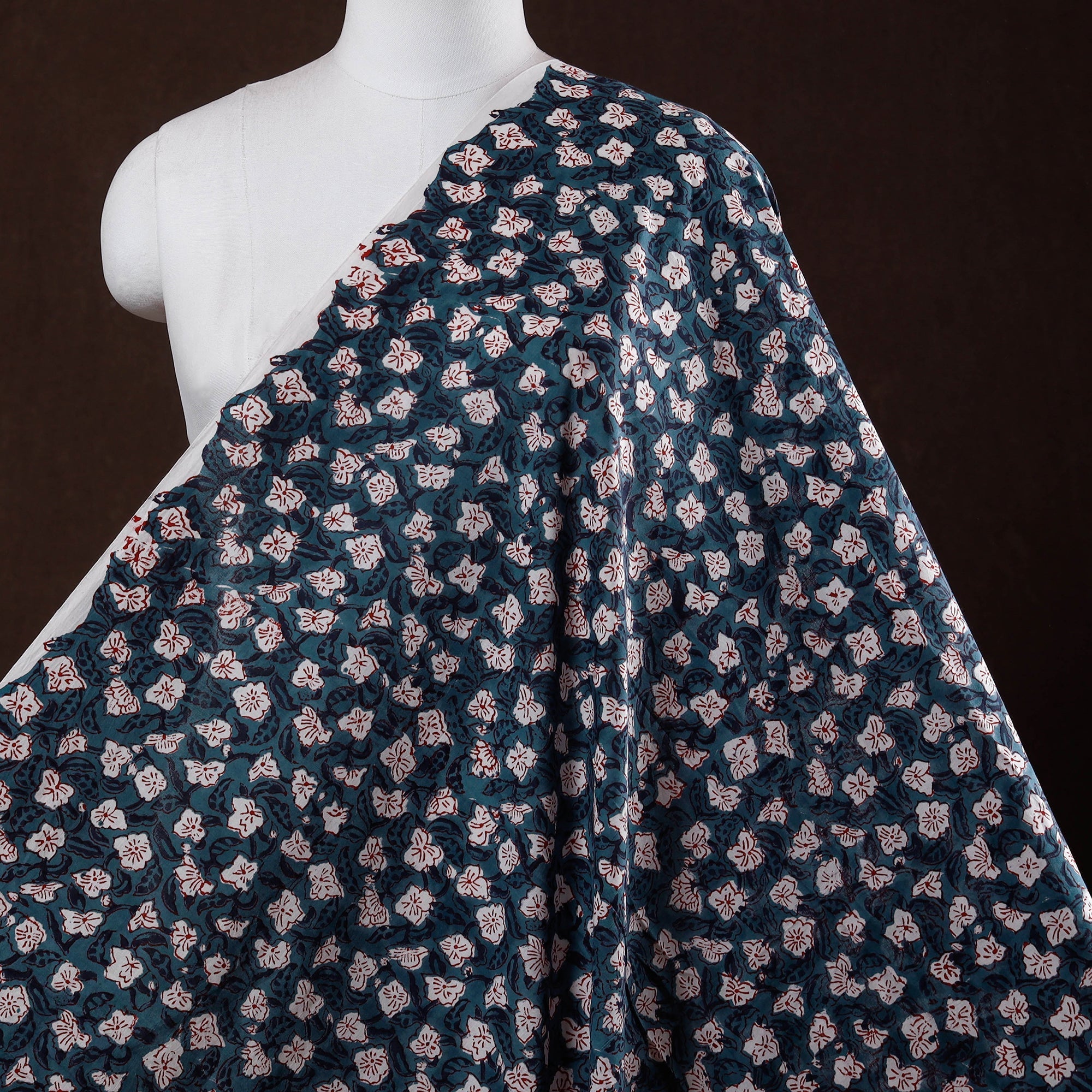 Blue sanganeri cotton fabric, printed using hand block techniques by artisans in Sanganer, Jaipur, Rajasthan, showcases delicate floral patterns created with traditional hand-carved wooden blocks and bleed-free VAT dyes. The breathable, lightweight cotton is ideal for making kurtas, dresses, tunics, or home decor items like cushions and curtains.