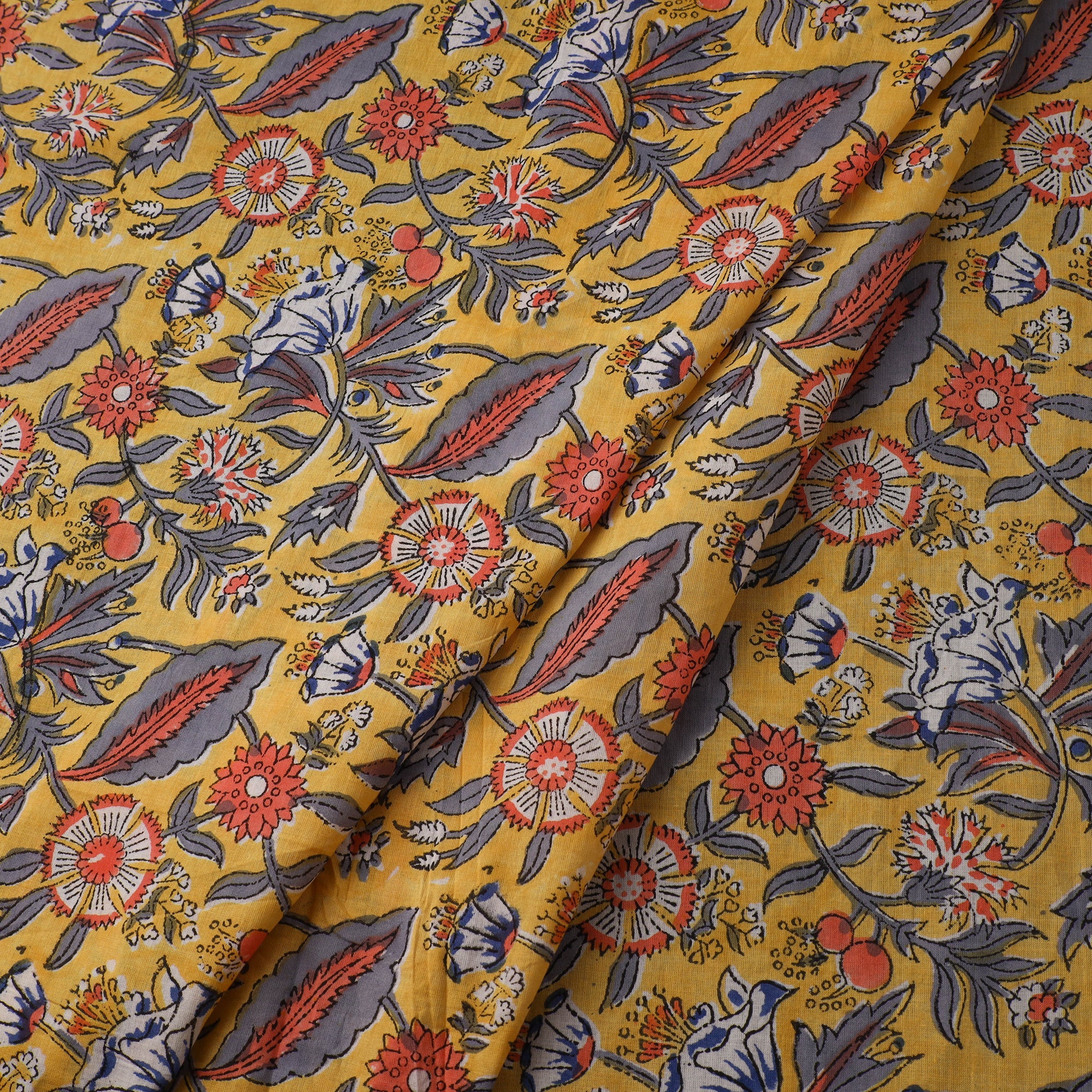 This yellow cotton sanganeri fabric captures the charm of Rajasthan’s block printing heritage. Crafted using hand-carved wooden blocks, artisans create intricate floral patterns. Perfect for making kurtas, dresses, tunics, or charming home accents like cushions and curtains, this soft, airy cotton ensures both style and comfort.