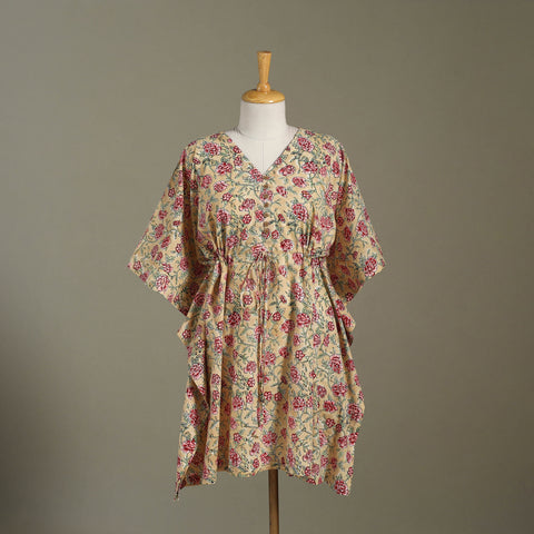 Enjoy effortless comfort in our beige sanganeri block print kaftan, crafted from soft, breathable cotton. Featuring timeless floral motifs in traditional sanganeri style, this free-flowing silhouette includes an adjustable drawstring at the waist for a personalised fit. Whether you're relaxing at home or heading out for a casual brunch, this kaftan blends easy elegance with all-day comfort.beige