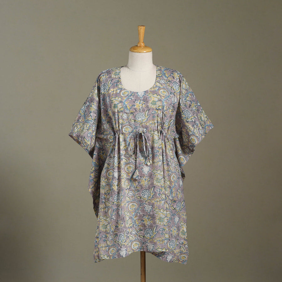 Enjoy effortless comfort in our purple sanganeri block print kaftan, crafted from soft, breathable cotton. Featuring timeless floral motifs in traditional sanganeri style, this free-flowing silhouette includes an adjustable drawstring at the waist for a personalised fit. Whether you're relaxing at home or heading out for a casual brunch, this kaftan blends easy elegance with all-day comfort.