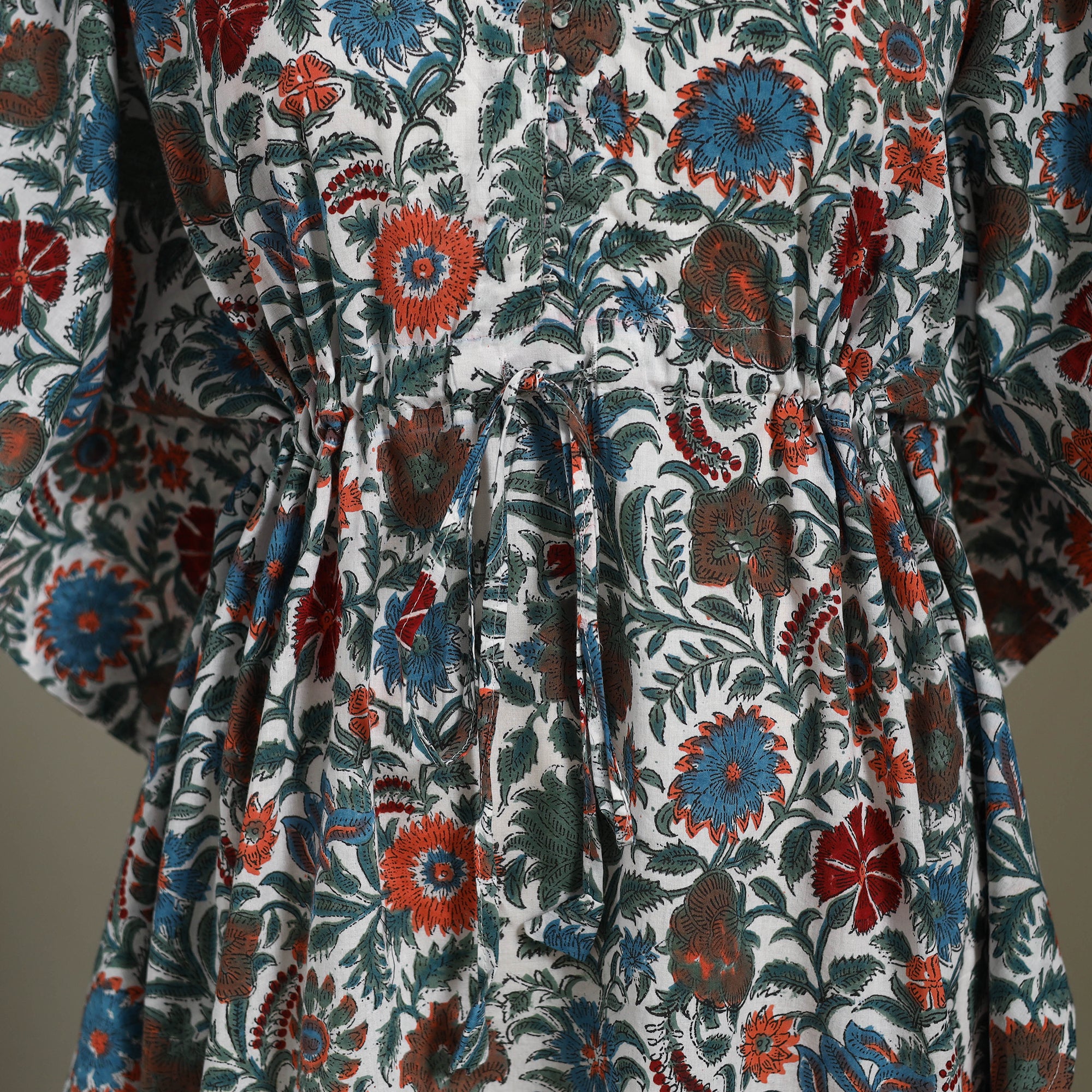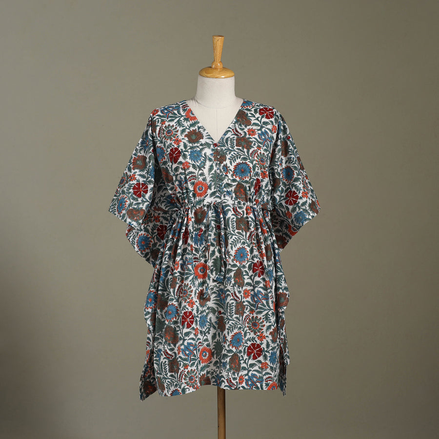 Enjoy effortless comfort in our multicolor sanganeri block print kaftan, crafted from soft, breathable cotton. Featuring timeless floral motifs in traditional sanganeri style, this free-flowing silhouette includes an adjustable drawstring at the waist for a personalised fit. Whether you're relaxing at home or heading out for a casual brunch, this kaftan blends easy elegance with all-day comfort.