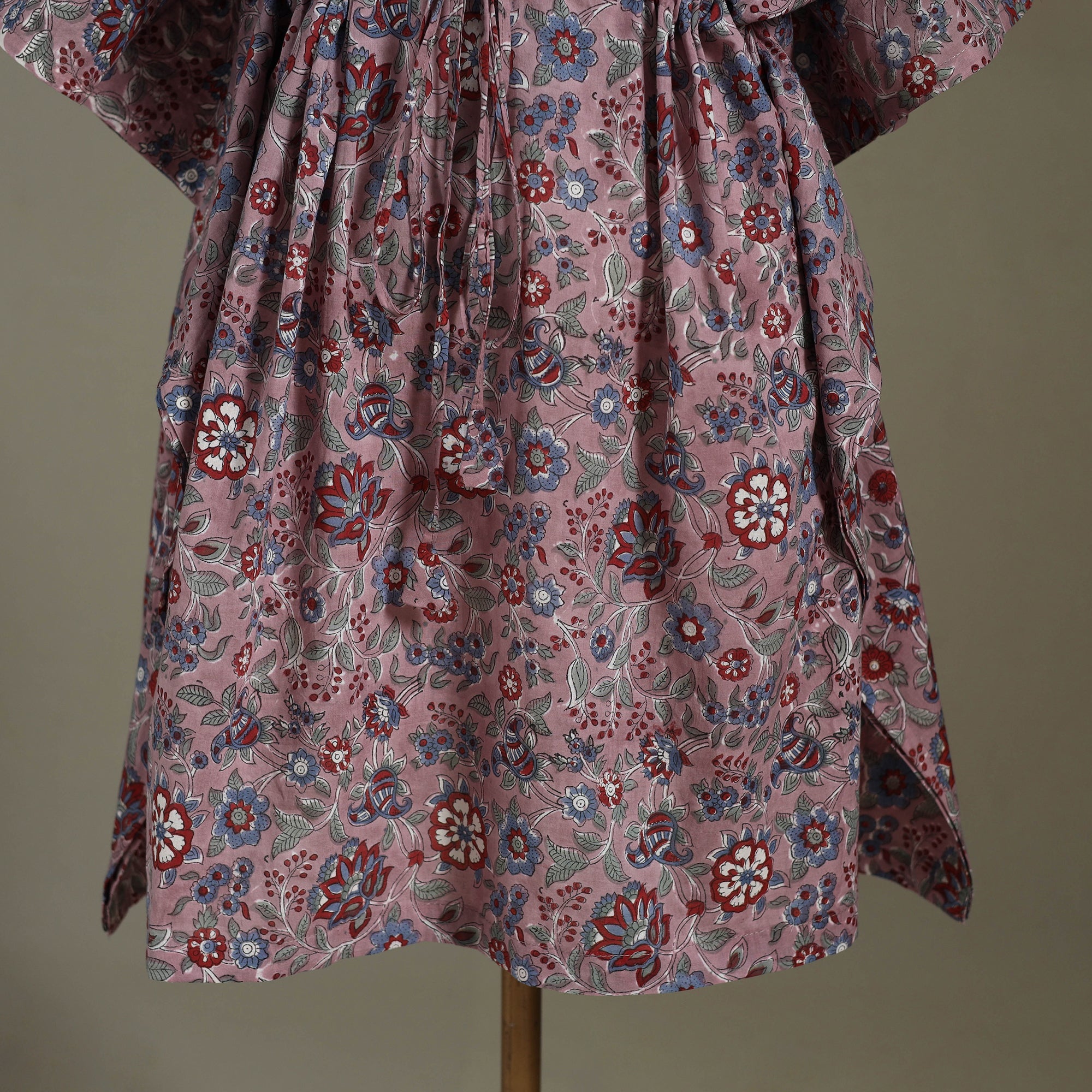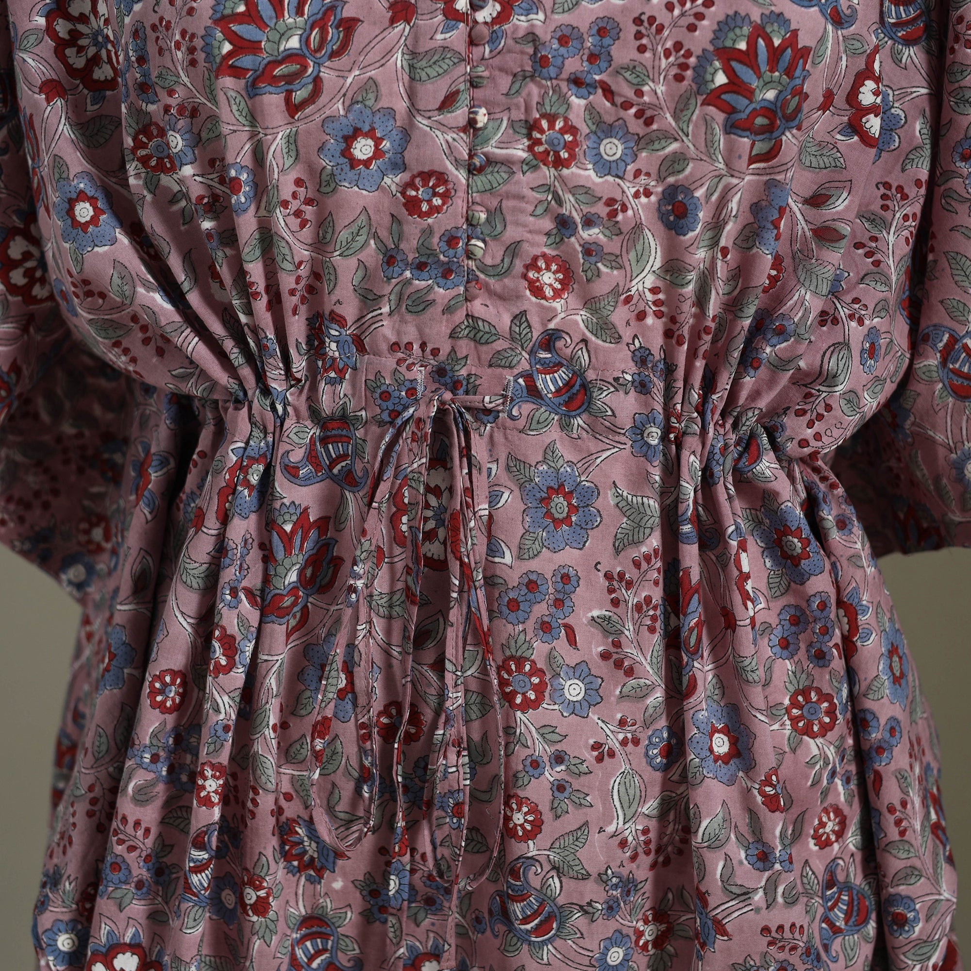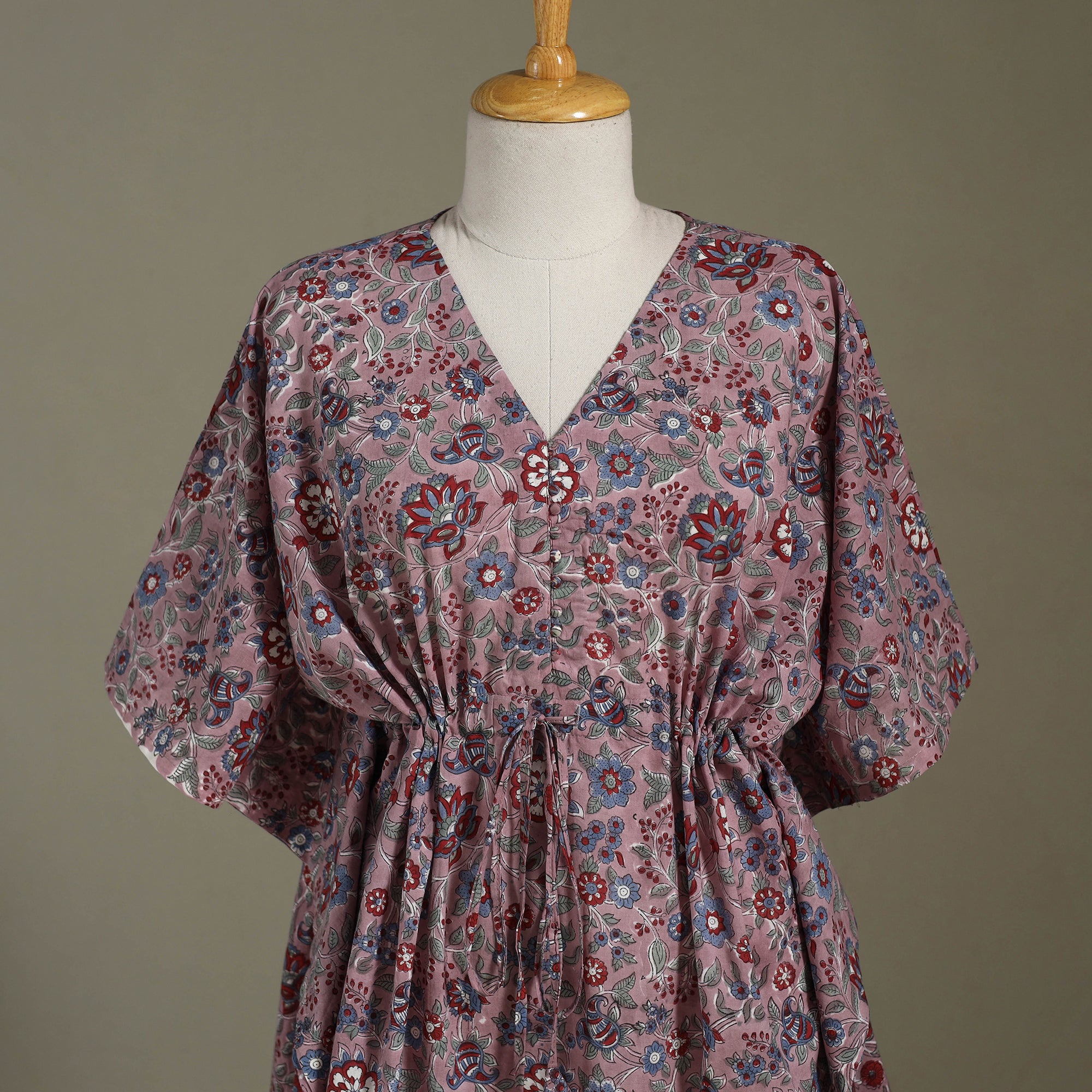 Enjoy effortless comfort in our purple sanganeri block print kaftan, crafted from soft, breathable cotton. Featuring timeless floral motifs in traditional sanganeri style, this free-flowing silhouette includes an adjustable drawstring at the waist for a personalised fit. Whether you're relaxing at home or heading out for a casual brunch, this kaftan blends easy elegance with all-day comfort.