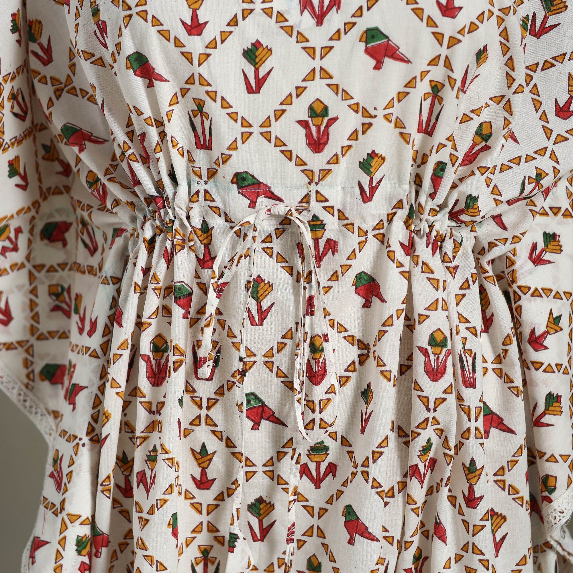 Enjoy effortless comfort in our white sanganeri block print kaftan, crafted from soft, breathable cotton. Featuring timeless floral motifs in traditional sanganeri style, this free-flowing silhouette includes an adjustable drawstring at the waist for a personalised fit. Whether you're relaxing at home or heading out for a casual brunch, this kaftan blends easy elegance with all-day comfort.