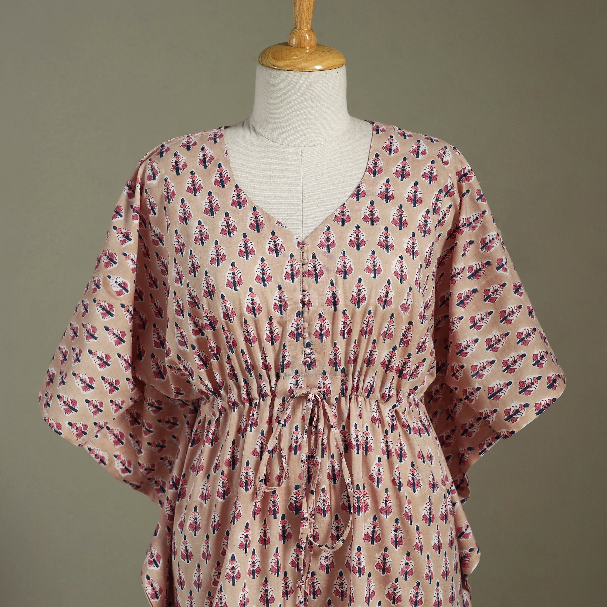 Enjoy effortless comfort in our peach sanganeri block print kaftan, crafted from soft, breathable cotton. Featuring timeless floral motifs in traditional sanganeri style, this free-flowing silhouette includes an adjustable drawstring at the waist for a personalised fit. Whether you're relaxing at home or heading out for a casual brunch, this kaftan blends easy elegance with all-day comfort.