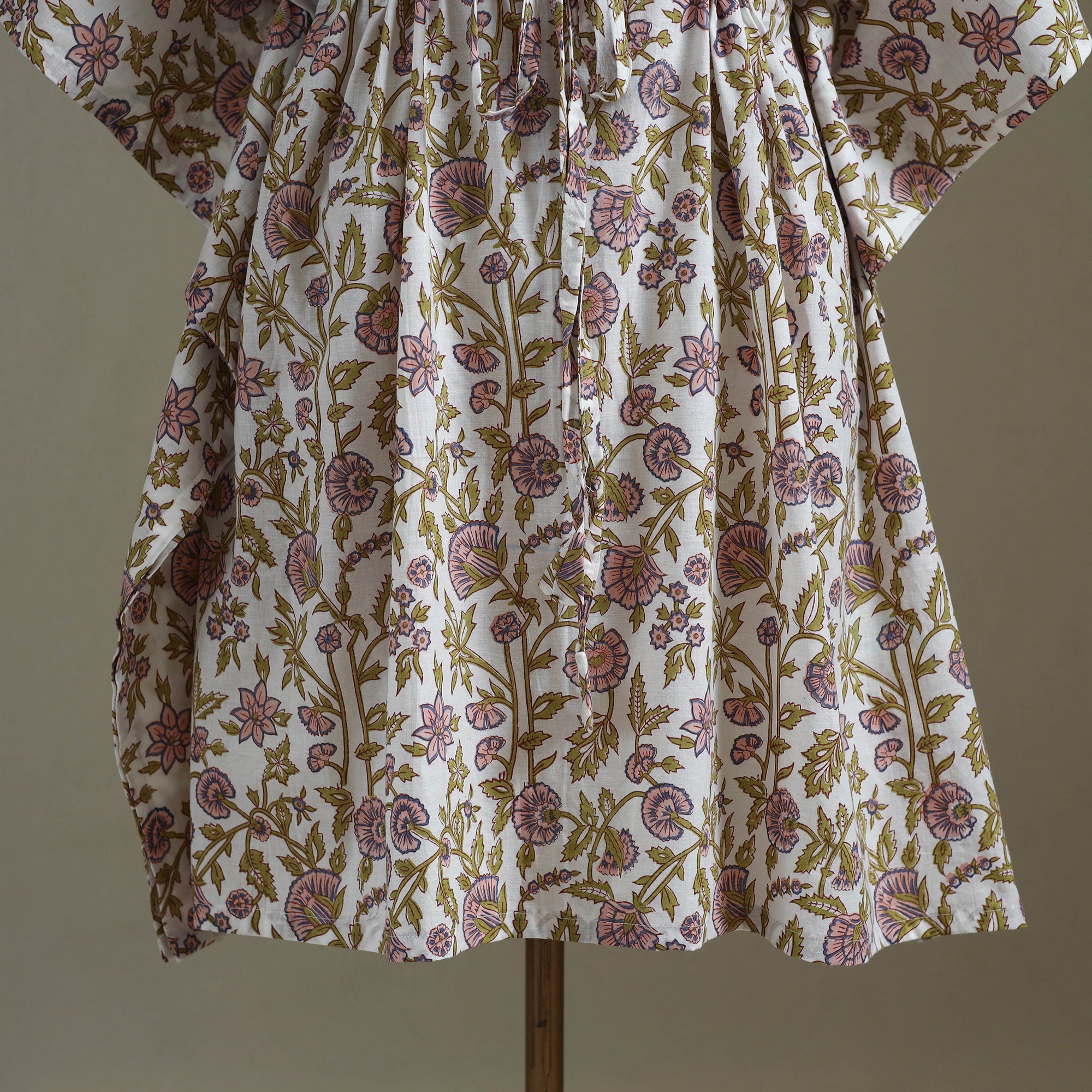 Enjoy effortless comfort in our white sanganeri block print kaftan, crafted from soft, breathable cotton. Featuring timeless floral motifs in traditional sanganeri style, this free-flowing silhouette includes an adjustable drawstring at the waist for a personalised fit. Whether you're relaxing at home or heading out for a casual brunch, this kaftan blends easy elegance with all-day comfort.