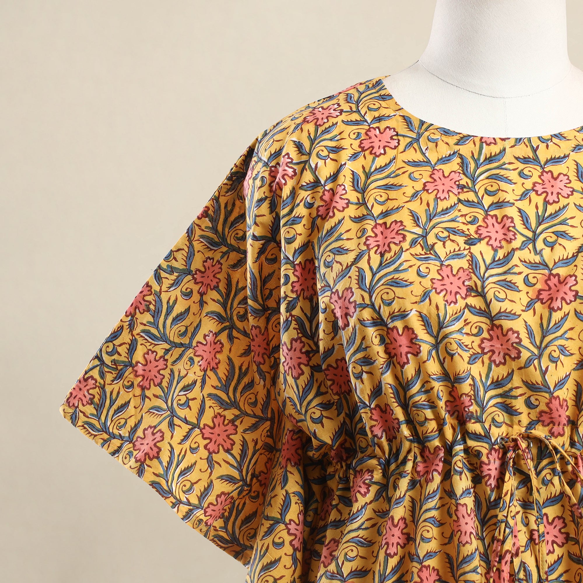 Experience the perfect blend of tradition and comfort with this yellow sanganeri block print cotton kaftan, designed for effortless style. Made from breathable cotton, the kaftan drapes gracefully with its relaxed fit. The adjustable drawstring waist ensures a custom fit, making it ideal for lounging, vacations, or casual day outs.
