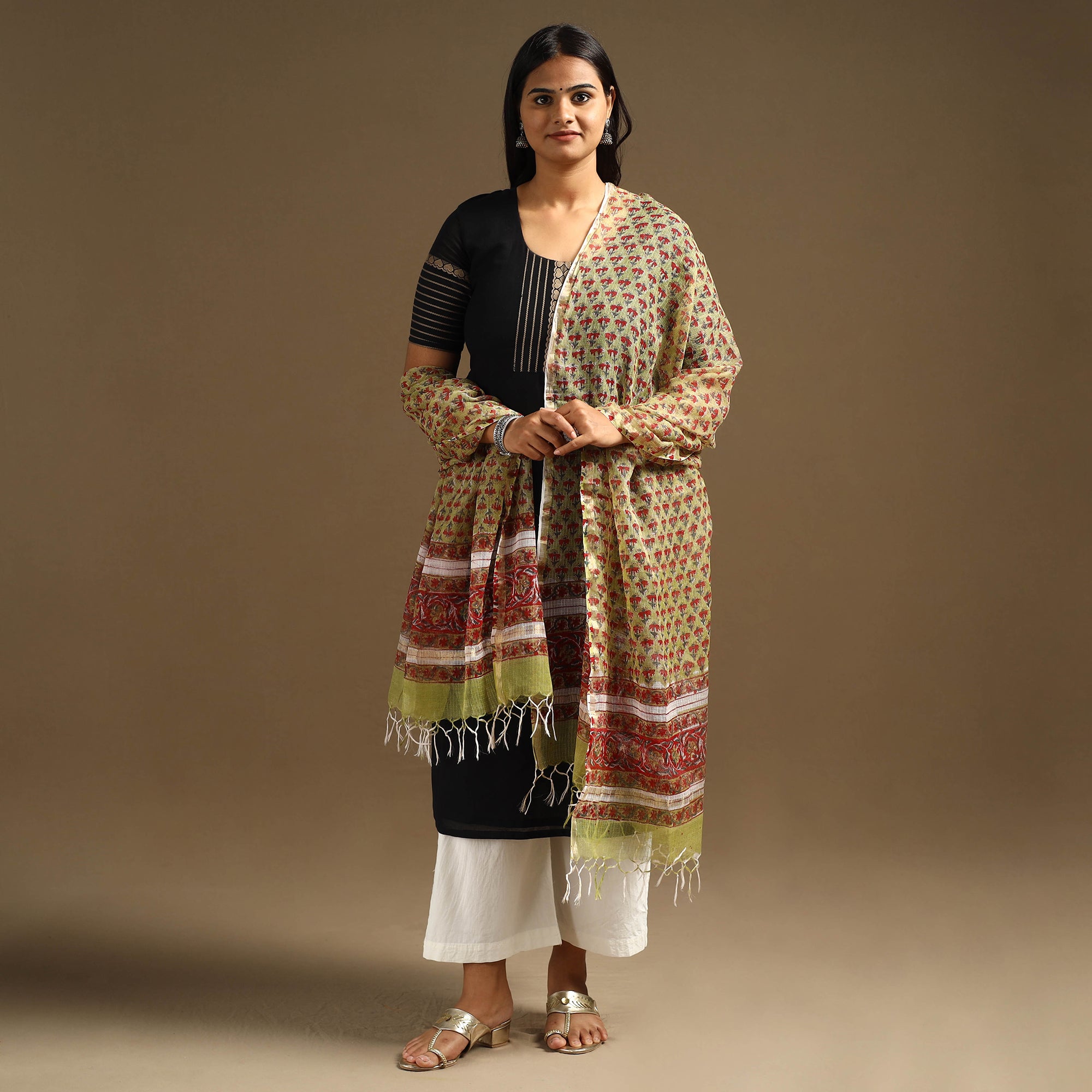 This green hand block printed kota doria dupatta beautifully blends tradition with elegance. Made from a cotton-silk blend, it has a breezy, lightweight texture that drapes effortlessly. The floral motifs, created using the sanganeri block printing technique from Sanganer near Jaipur, lend a charming touch to both everyday outfits and festive wear.