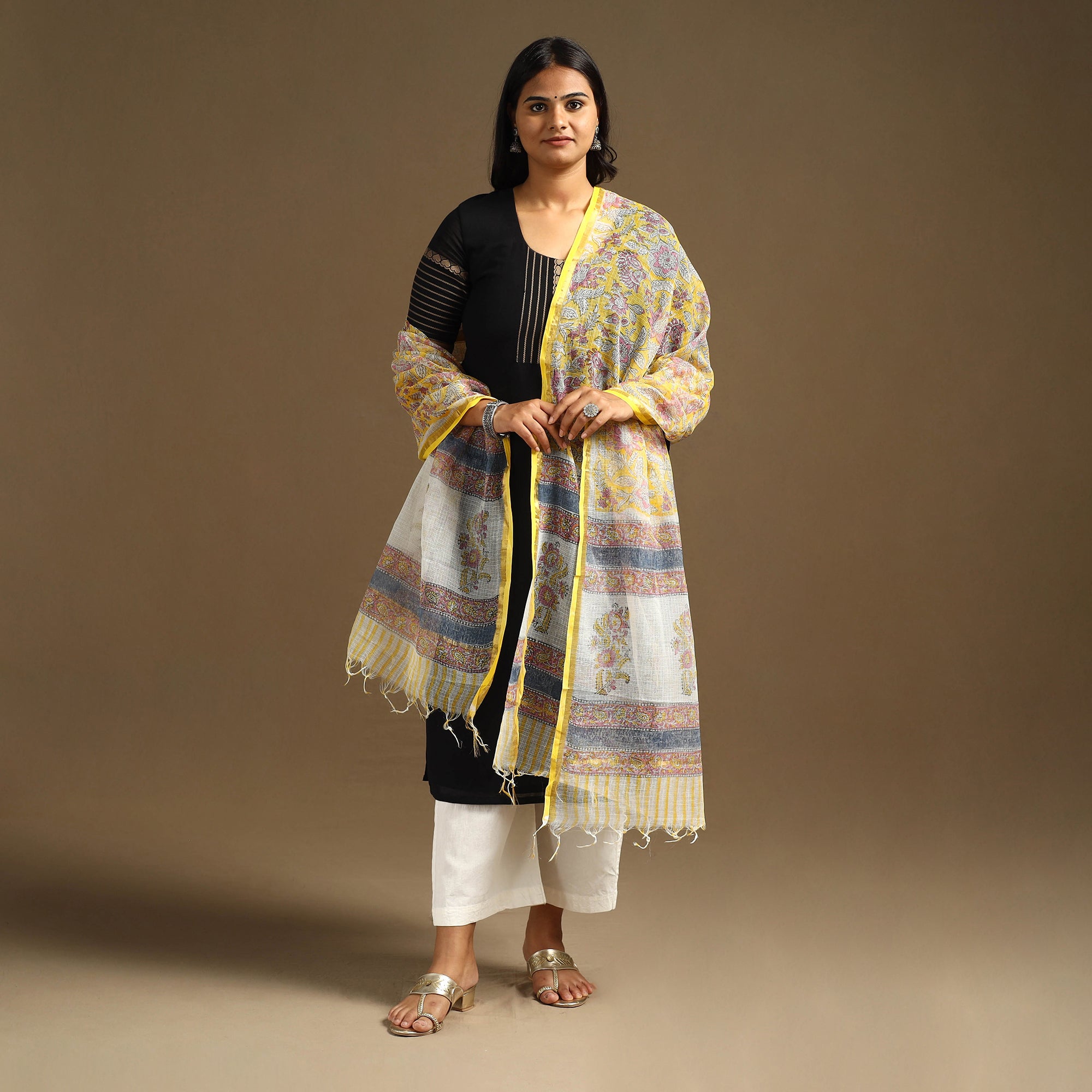 This yellow hand block printed kota doria dupatta beautifully blends tradition with elegance. Made from a cotton-silk blend, it has a breezy, lightweight texture that drapes effortlessly. The floral motifs, created using the sanganeri block printing technique from Sanganer near Jaipur, lend a charming touch to both everyday outfits and festive wear.