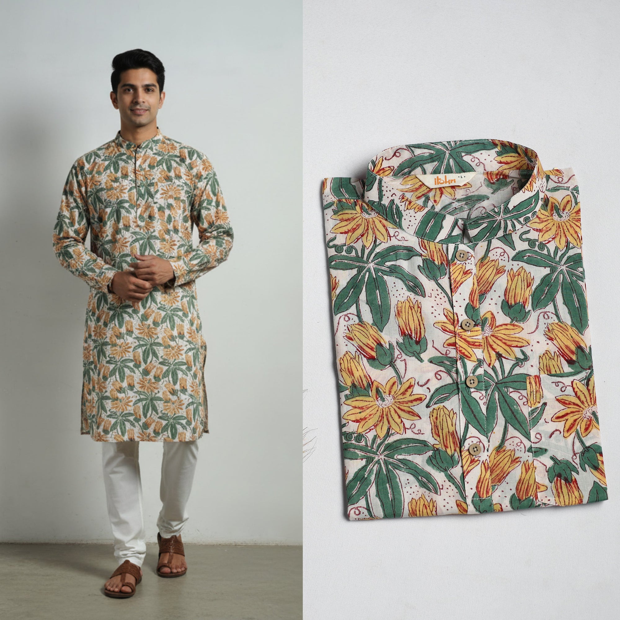 Sanganeri hand block print pure cotton short kurta for men, featuring sanganeri hand block printing, a centuries-old technique practiced for over 500 years and known for its fine detailing and floral patterns. Dyed using bleed-free VAT colours, it has full sleeves, front button placket with chinese collar and convenient front pocket making it ideal for daily wear or casual outings.