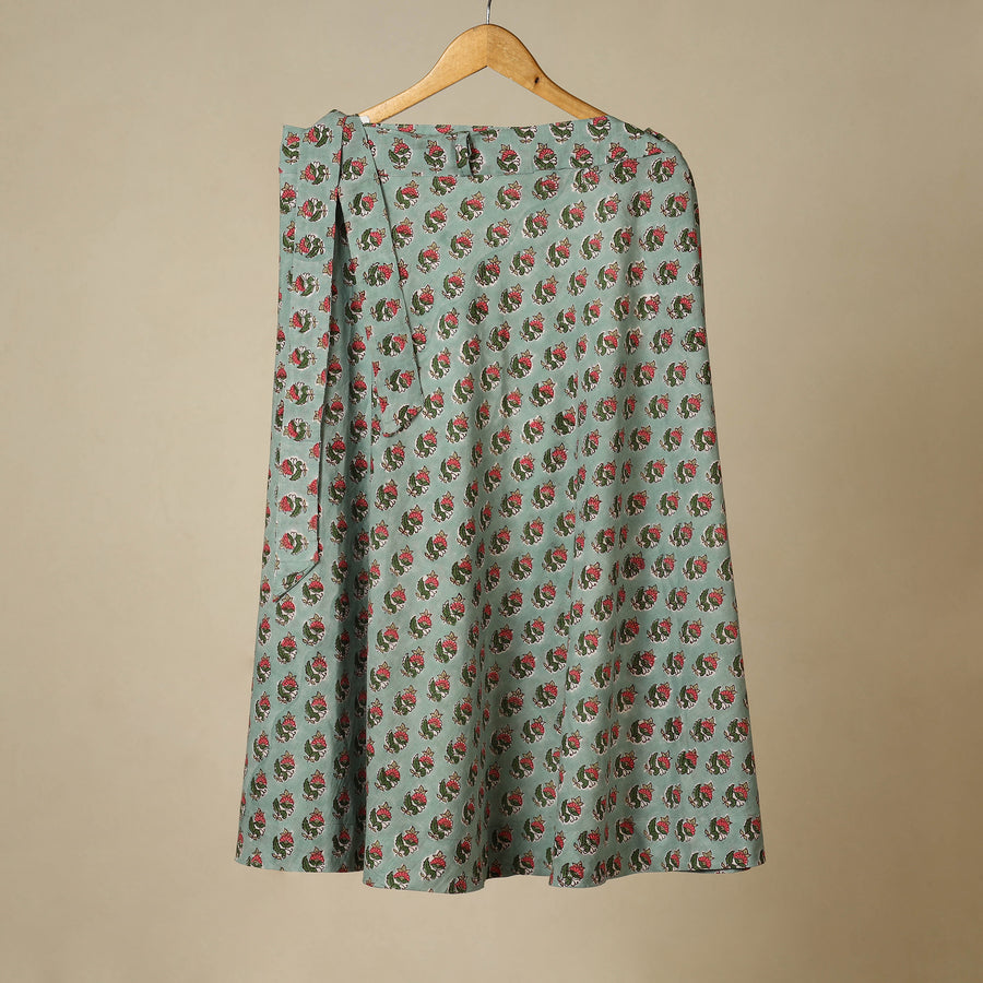 Add charm to your wardrobe with this green sanganeri hand block print cotton wrap-around skirt. Featuring a classic tie-up waist closure, this skirt blends comfort with ethnic elegance. The intricate motifs are created using the traditional sanganeri printing technique, which originated in Sanganer, Rajasthan. Known for its floral patterns, this skirt is ideal for daily wear, vacations, or relaxed festive styling.