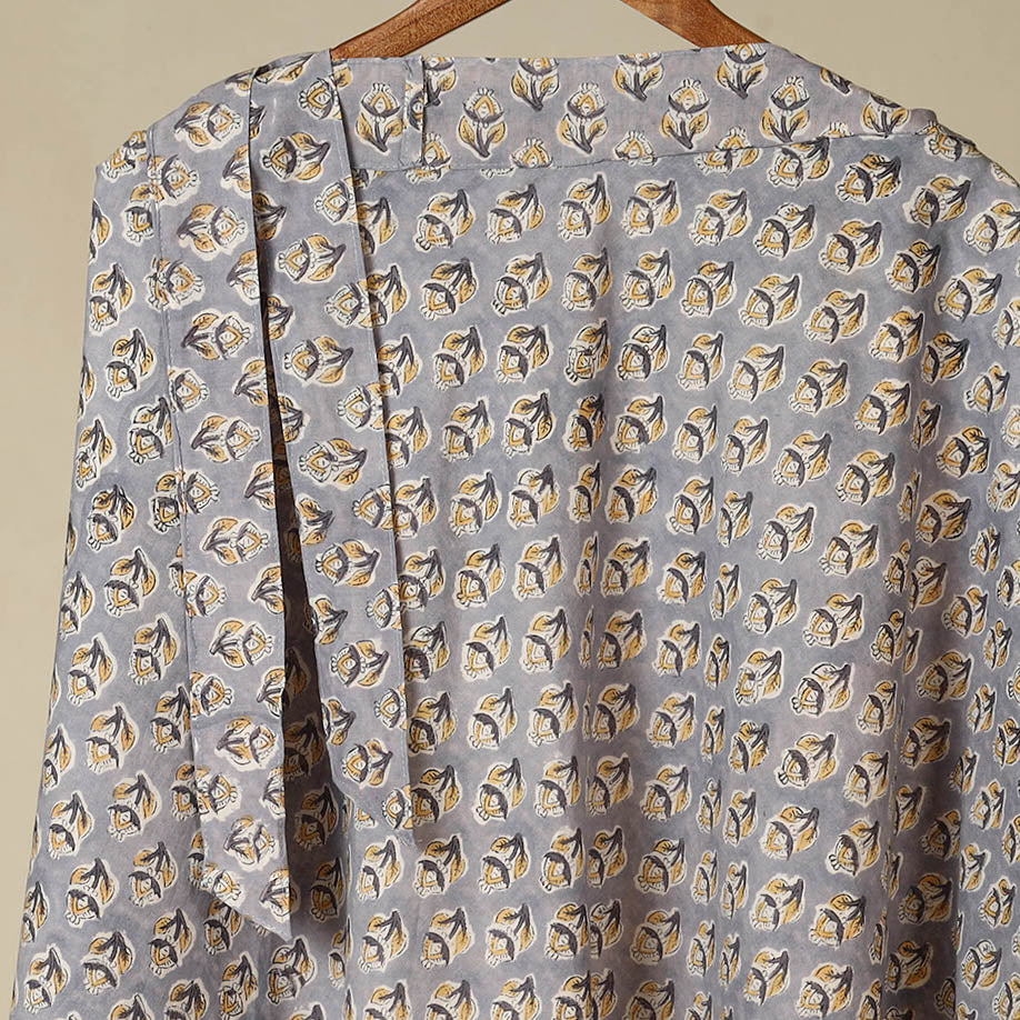 Add charm to your wardrobe with this grey sanganeri hand block print cotton wrap-around skirt. Featuring a classic tie-up waist closure, this skirt blends comfort with ethnic elegance. The intricate motifs are created using the traditional sanganeri printing technique, which originated in Sanganer, Rajasthan. Known for its floral patterns, this skirt is ideal for daily wear, vacations, or relaxed festive styling.