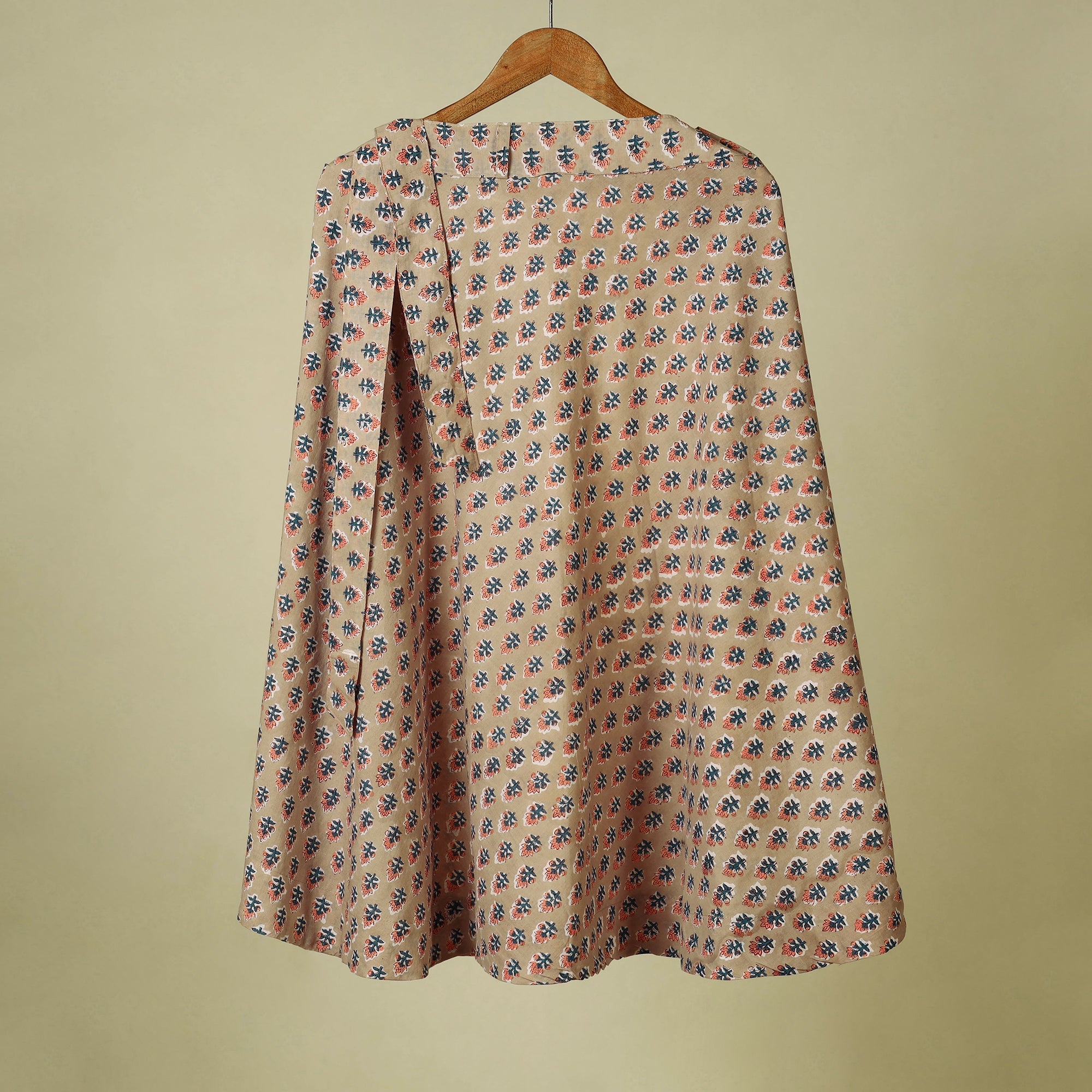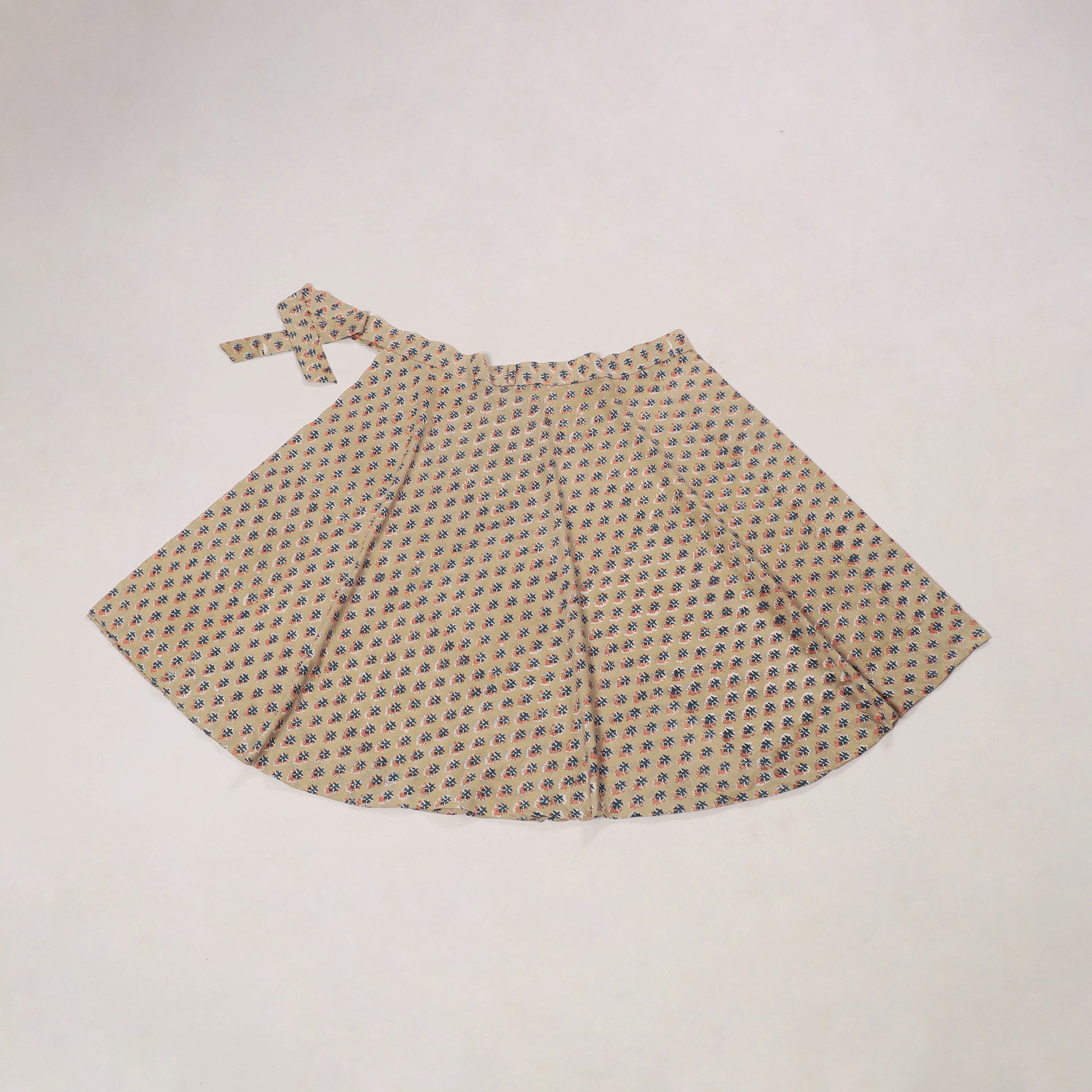 Add charm to your wardrobe with this beige sanganeri hand block print cotton wrap-around skirt. Featuring a classic tie-up waist closure, this skirt blends comfort with ethnic elegance. The intricate motifs are created using the traditional sanganeri printing technique, which originated in Sanganer, Rajasthan. Known for its floral patterns, this skirt is ideal for daily wear, vacations, or relaxed festive styling.
