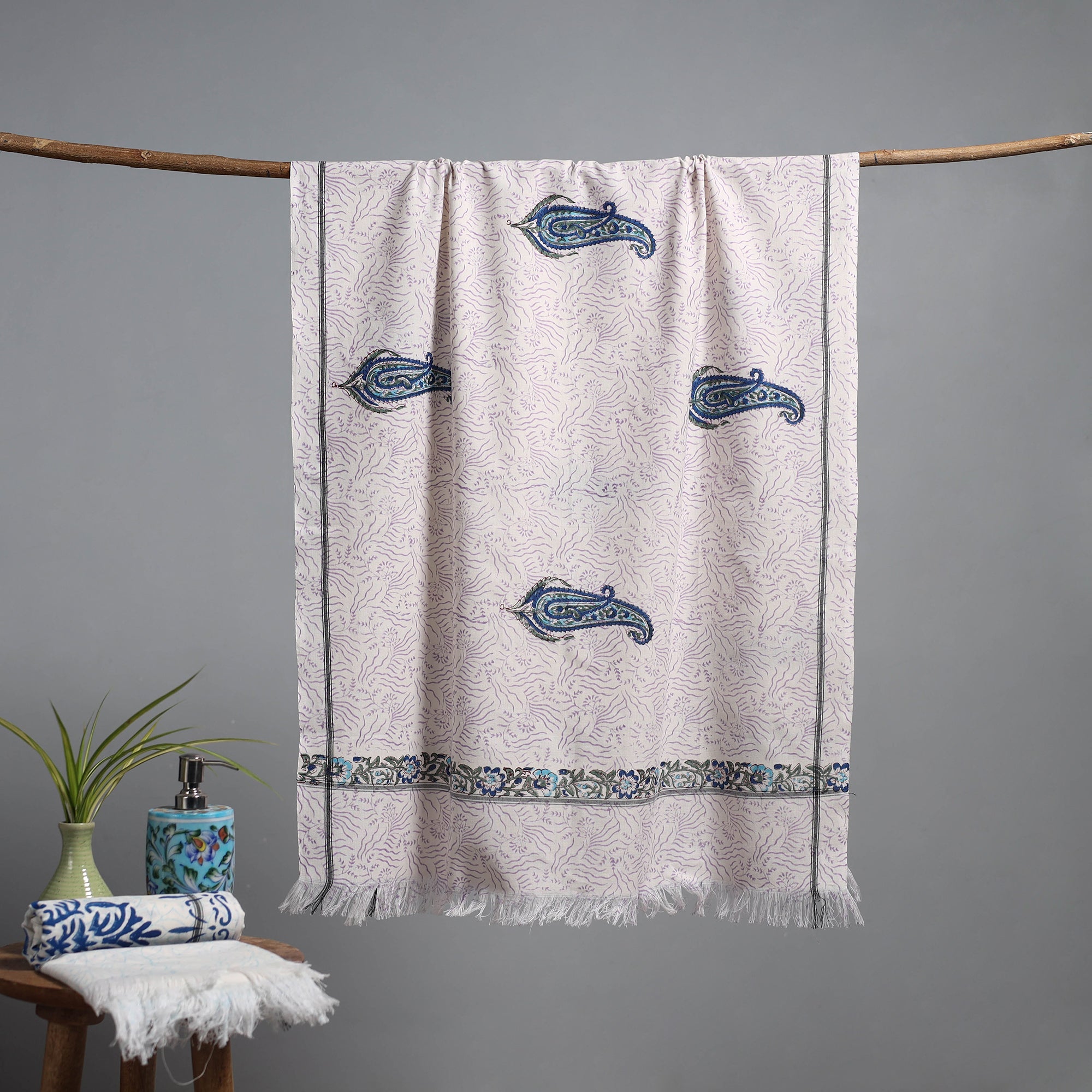 Sanganeri cotton towel is handwoven in Jhiri, Rajasthan and using traditional hand block-printing techniques by Purushottam Chhipa. Printed with bleed-free VAT dyes it features long-lasting and vibrant designs. A practical choice for everyday use, it reflects the beauty of traditional textile printing.
