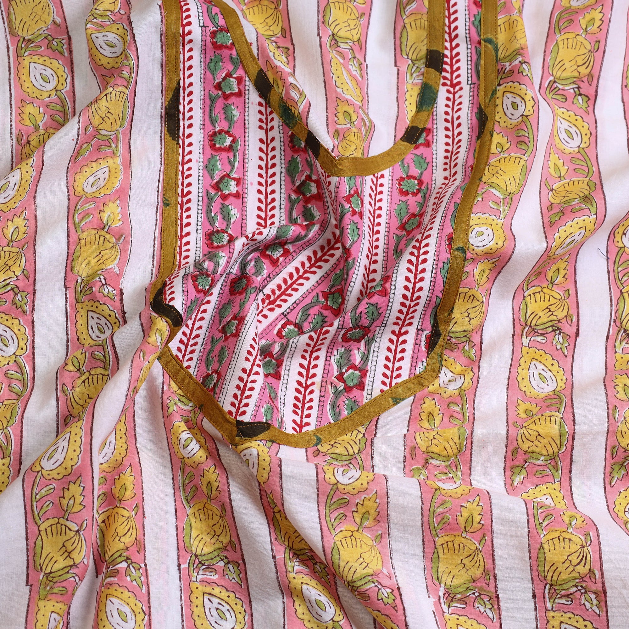 Enhance the look of your attire with our pink sanganeri block print patchwork cotton kurta material. It features intricate floral block print patterns and stunning patchwork design. You will love to wear this as it is perfect for special occasions, formal or semi-casual look.