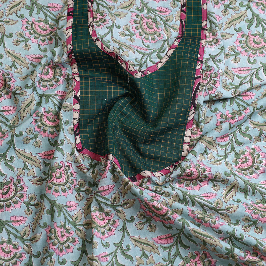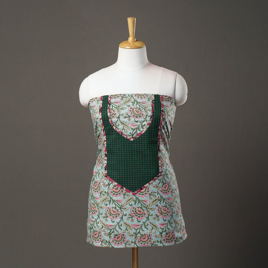 Enhance the look of your attire with our green sanganeri block print patchwork cotton kurta material. It features intricate floral block print patterns and stunning patchwork design. You will love to wear this as it is perfect for special occasions, formal or semi-casual look.