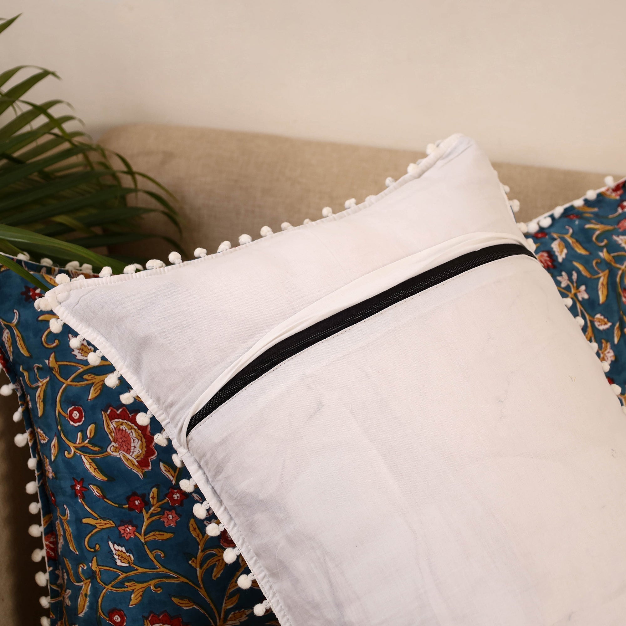 Sanganeri pillow cover (set of 2) with pom pom crafted by skilled artisans in Jaipur Rajasthan. Made from cotton each piece features intricate motifs created using bleed-free VAT dyes. Sanganeri block printing is a centuries-old art known for its floral patterns. Suitable for use on beds or sofas for everyday comfort and styling.