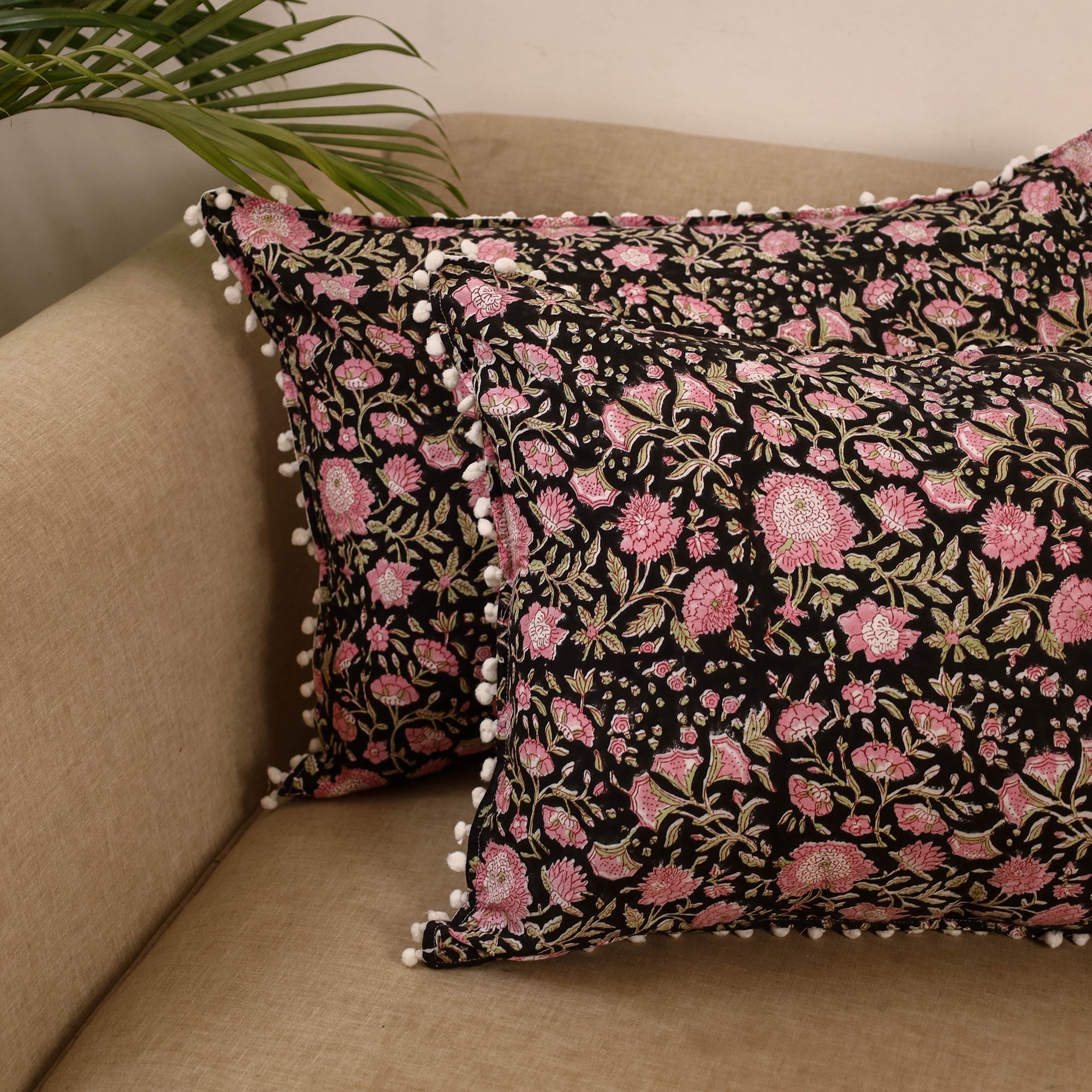 Sanganeri pillow cover (set of 2) with pom pom crafted by skilled artisans in Jaipur Rajasthan. Made from cotton each piece features intricate motifs created using bleed-free VAT dyes. Sanganeri block printing is a centuries-old art known for its floral patterns. Suitable for use on beds or sofas for everyday comfort and styling.