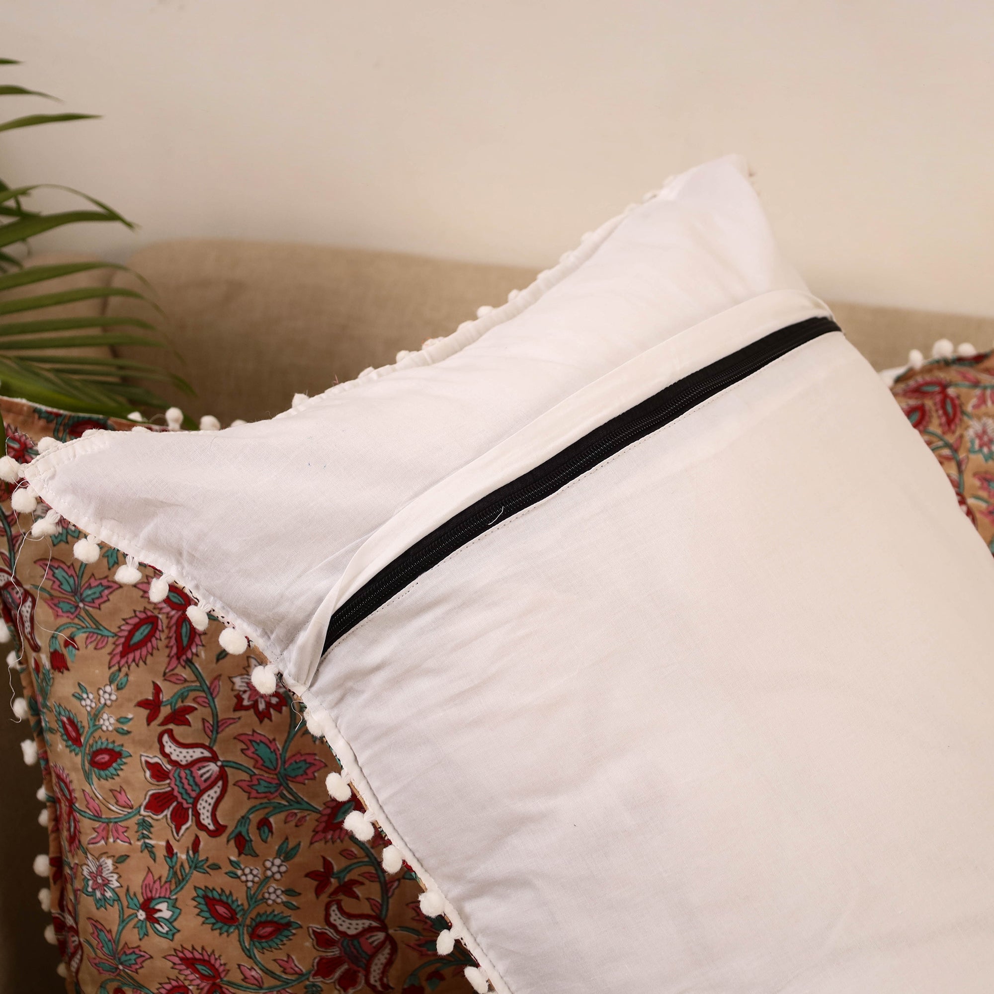 Sanganeri pillow cover (set of 2) with pom pom crafted by skilled artisans in Jaipur Rajasthan. Made from cotton each piece features intricate motifs created using bleed-free VAT dyes. Sanganeri block printing is a centuries-old art known for its floral patterns. Suitable for use on beds or sofas for everyday comfort and styling.