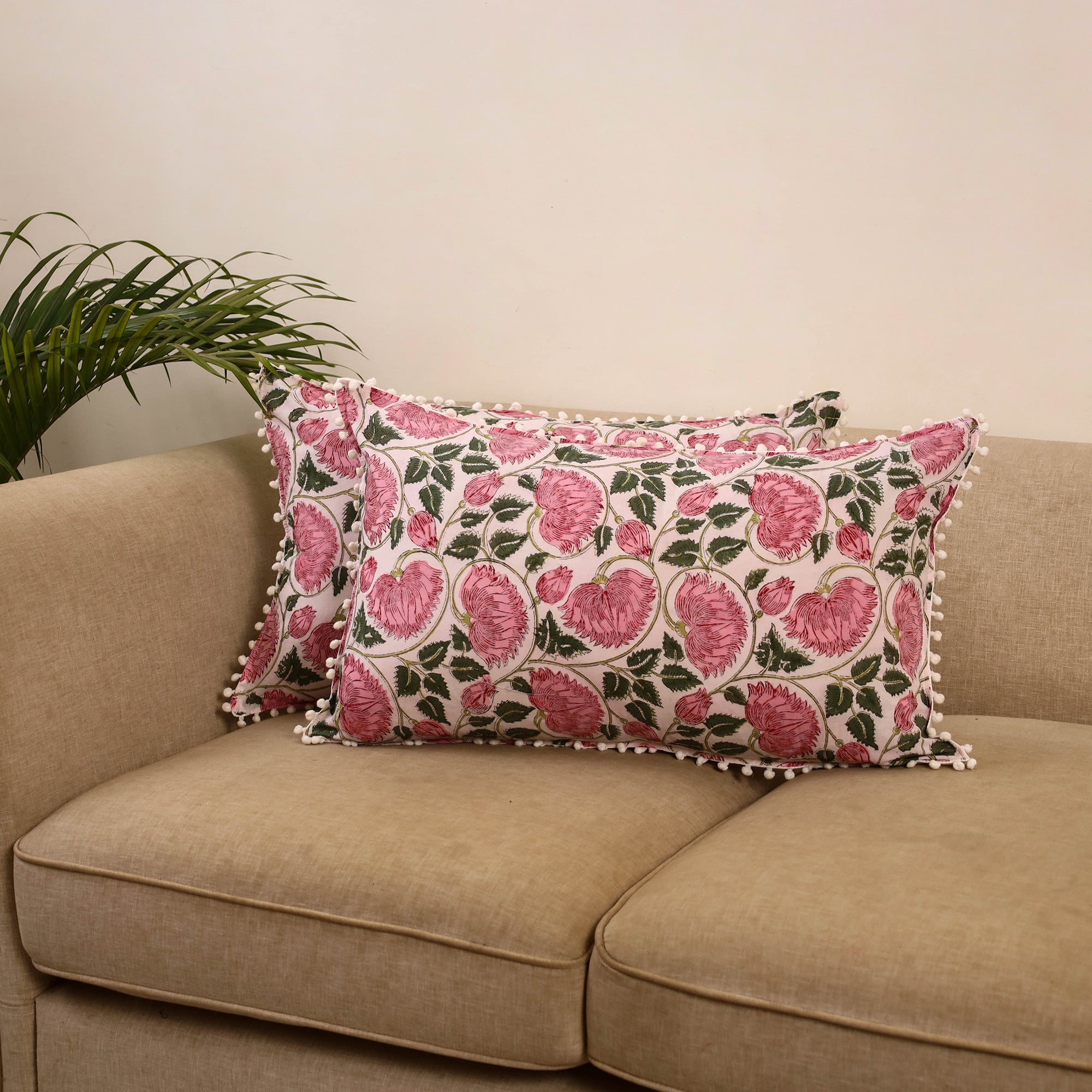 Sanganeri pillow cover (set of 2) with pom pom crafted by skilled artisans in Jaipur Rajasthan. Made from cotton each piece features intricate motifs created using bleed-free VAT dyes. Sanganeri block printing is a centuries-old art known for its floral patterns. Suitable for use on beds or sofas for everyday comfort and styling.