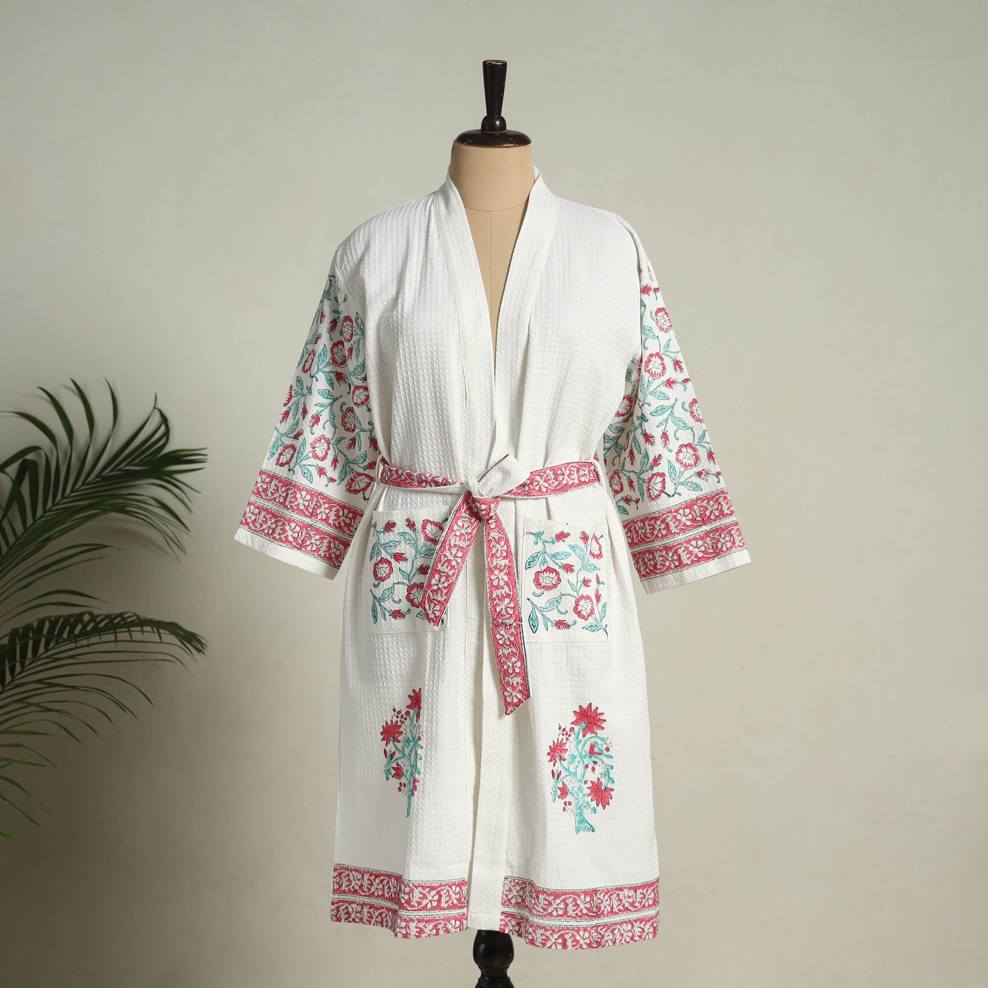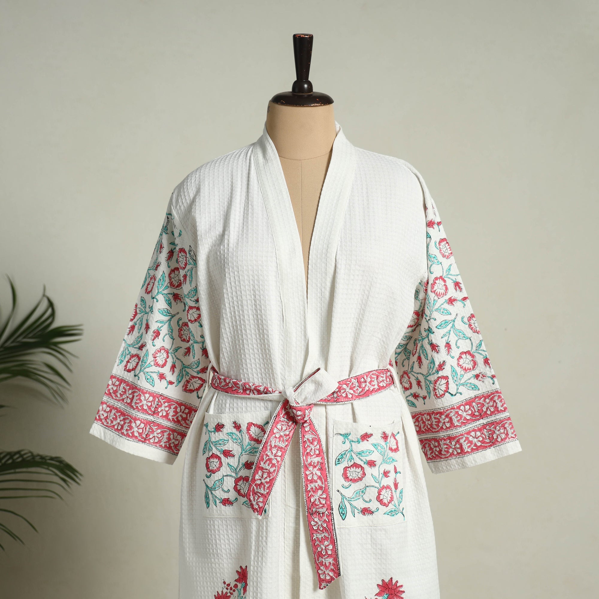White - Sanganeri Block Print Waffle Weave Handwoven Bath Robe 01