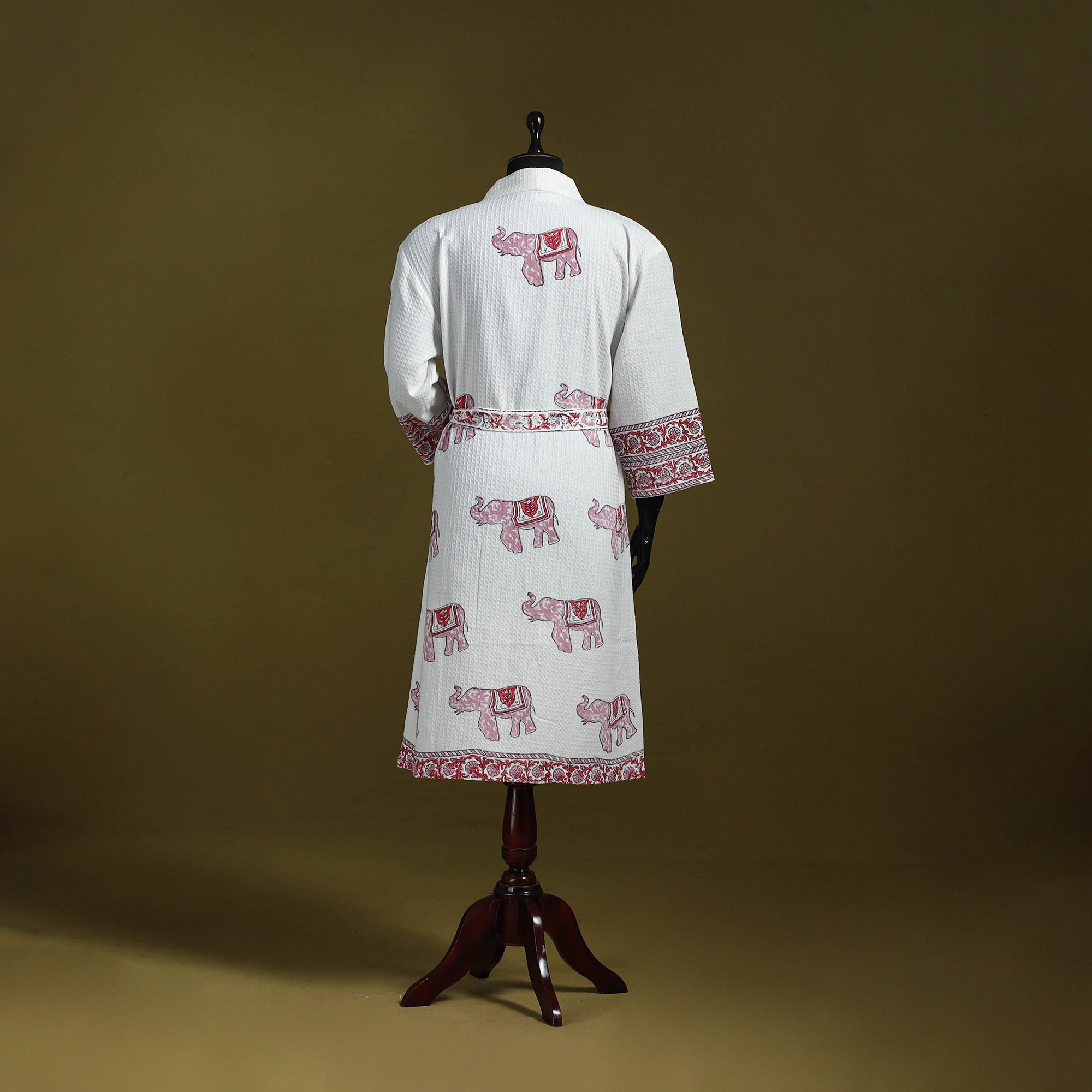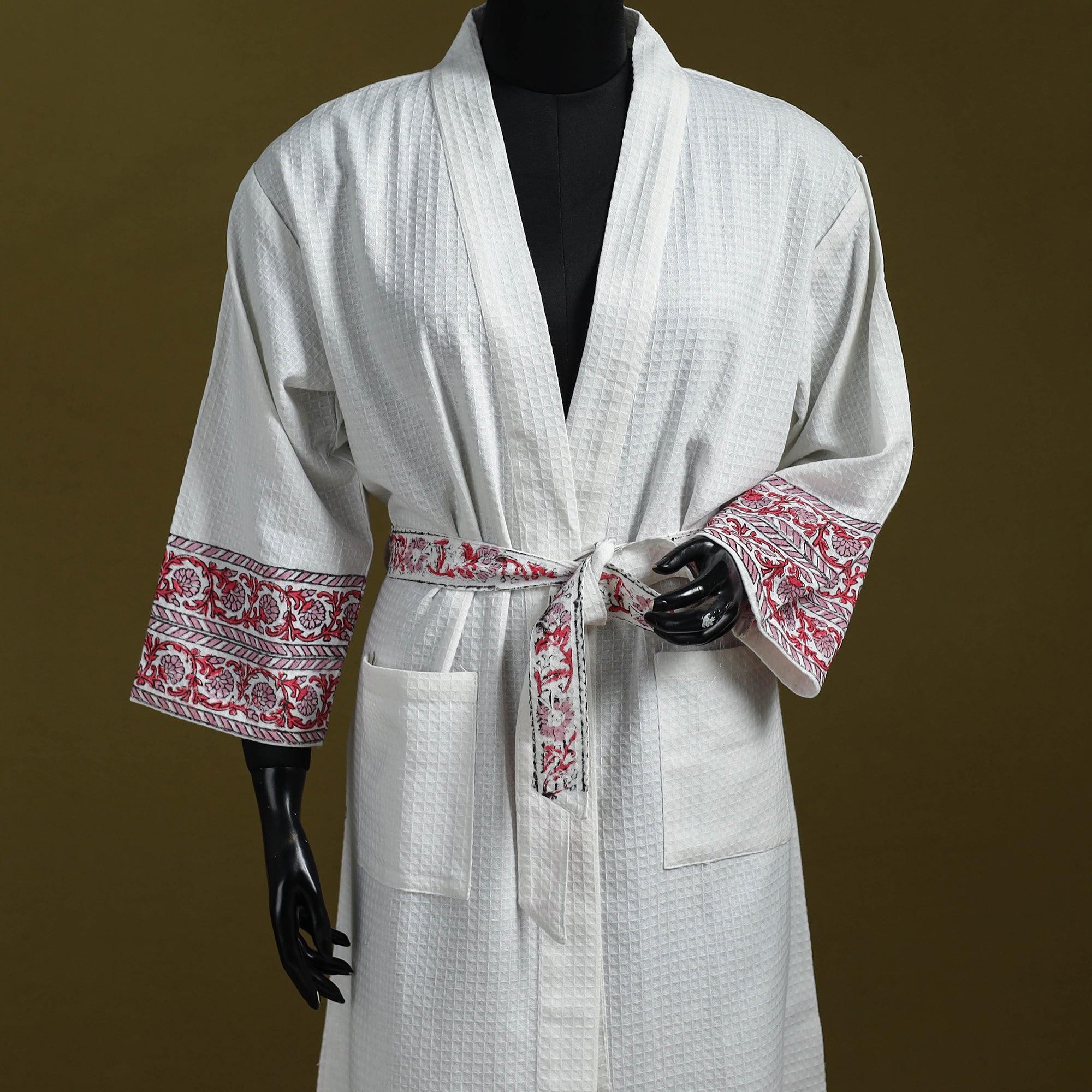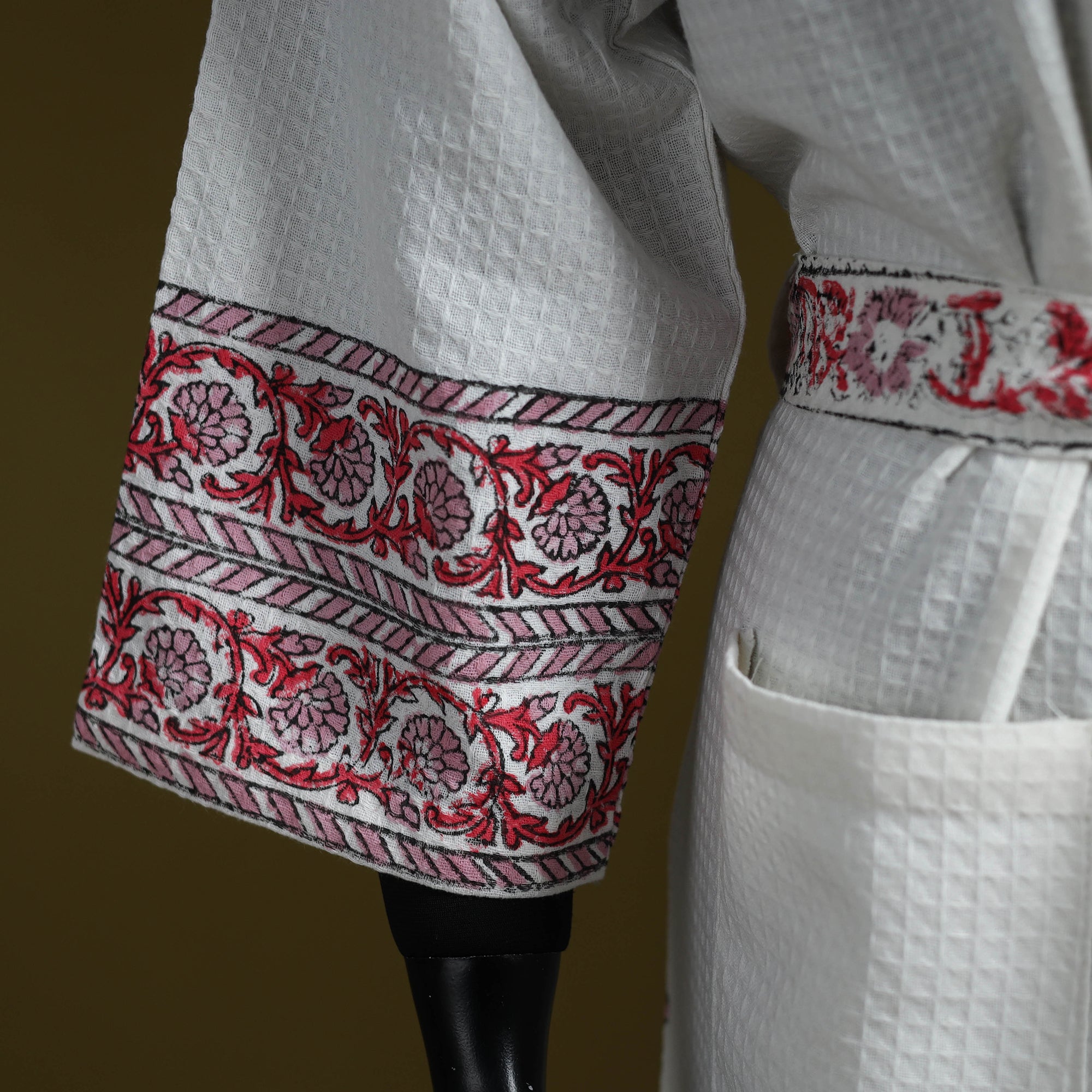 White - Sanganeri Block Print Waffle Weave Handwoven Bath Robe 01