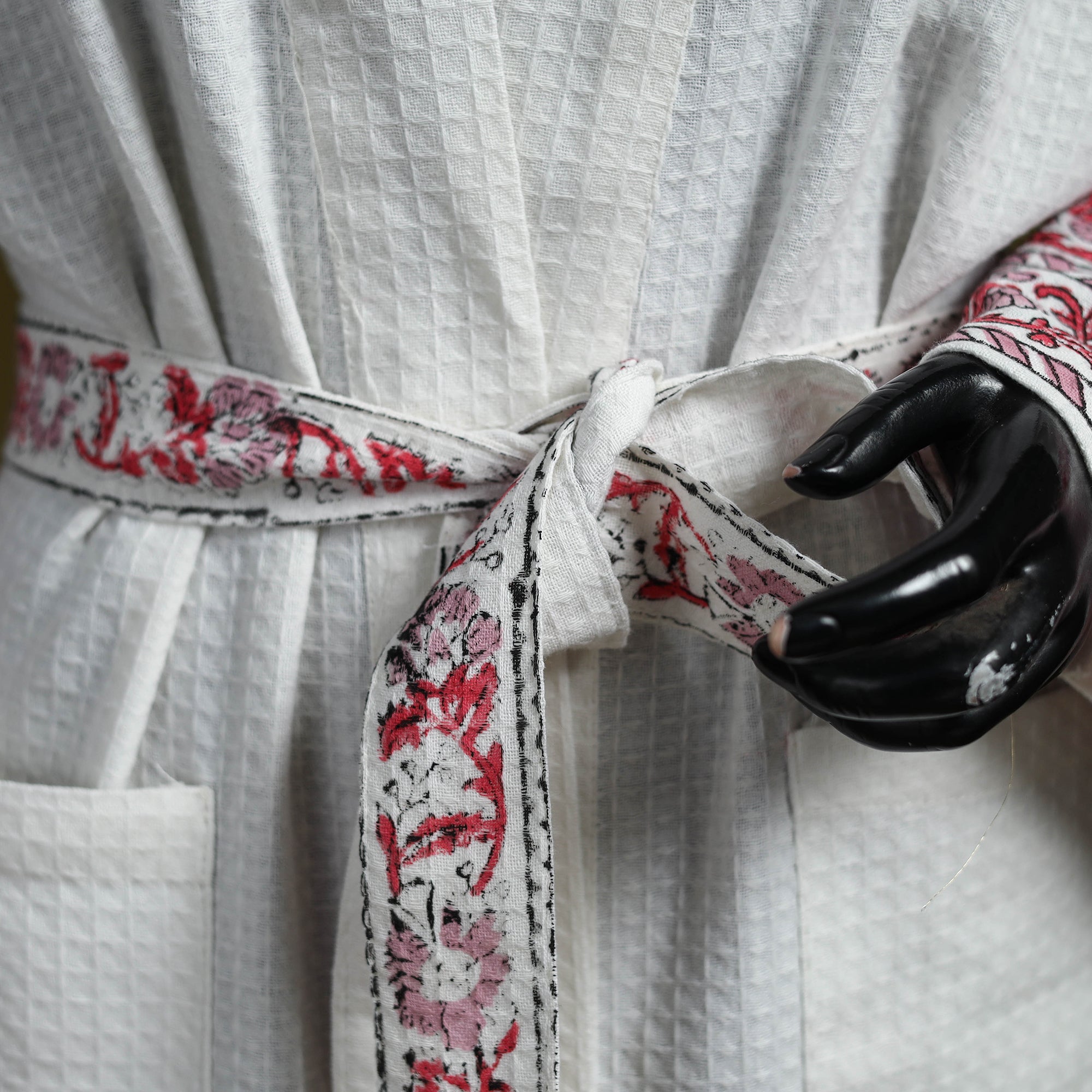 White sanganeri block print waffle weave bath robe is crafted in Rajasthan by artisans Ashok Kumar Chhipa and Lalit Kishore Chhipa using handwoven cotton with a 6-shaft weave for better absorbency. It features vibrant VAT-dyed prints two side pockets for convenience and a separate belt for a comfortable fit. Lightweight breathable and easy to wear it is ideal for showers, spa days or relaxing mornings.