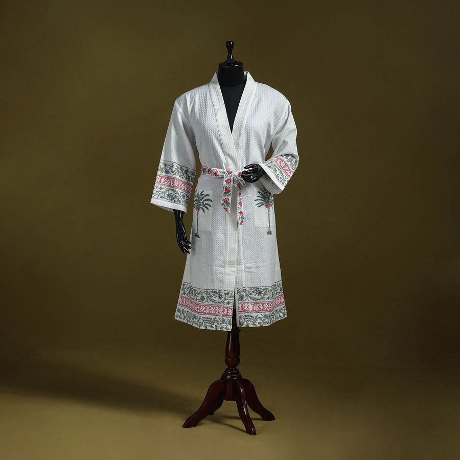 White - Sanganeri Block Print Waffle Weave Handwoven Bath Robe 04