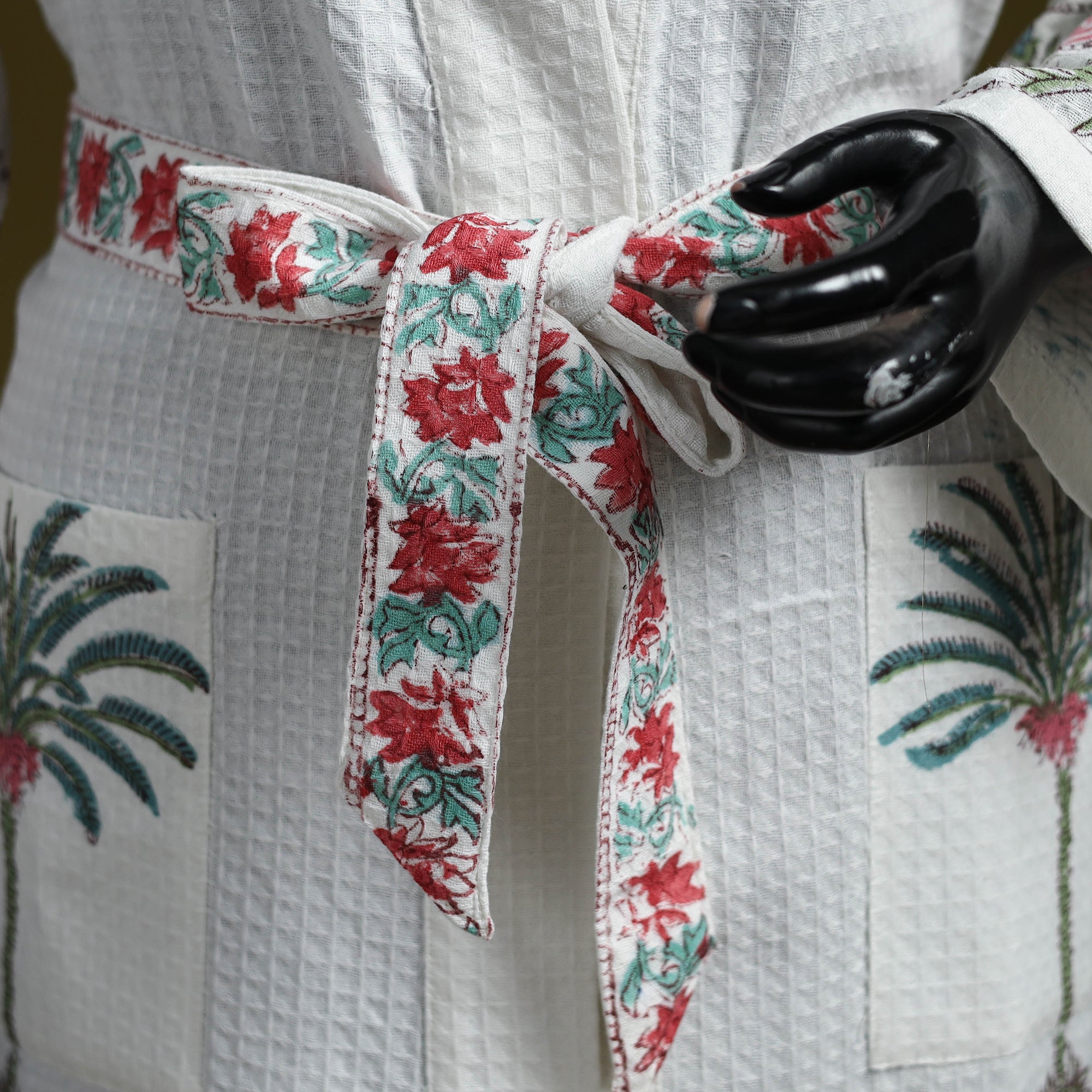 White sanganeri block print waffle weave bath robe is crafted in Rajasthan by artisans Ashok Kumar Chhipa and Lalit Kishore Chhipa using handwoven cotton with a 6-shaft weave for better absorbency. It features vibrant VAT-dyed prints two side pockets for convenience and a separate belt for a comfortable fit. Lightweight breathable and easy to wear it is ideal for showers, spa days or relaxing mornings.