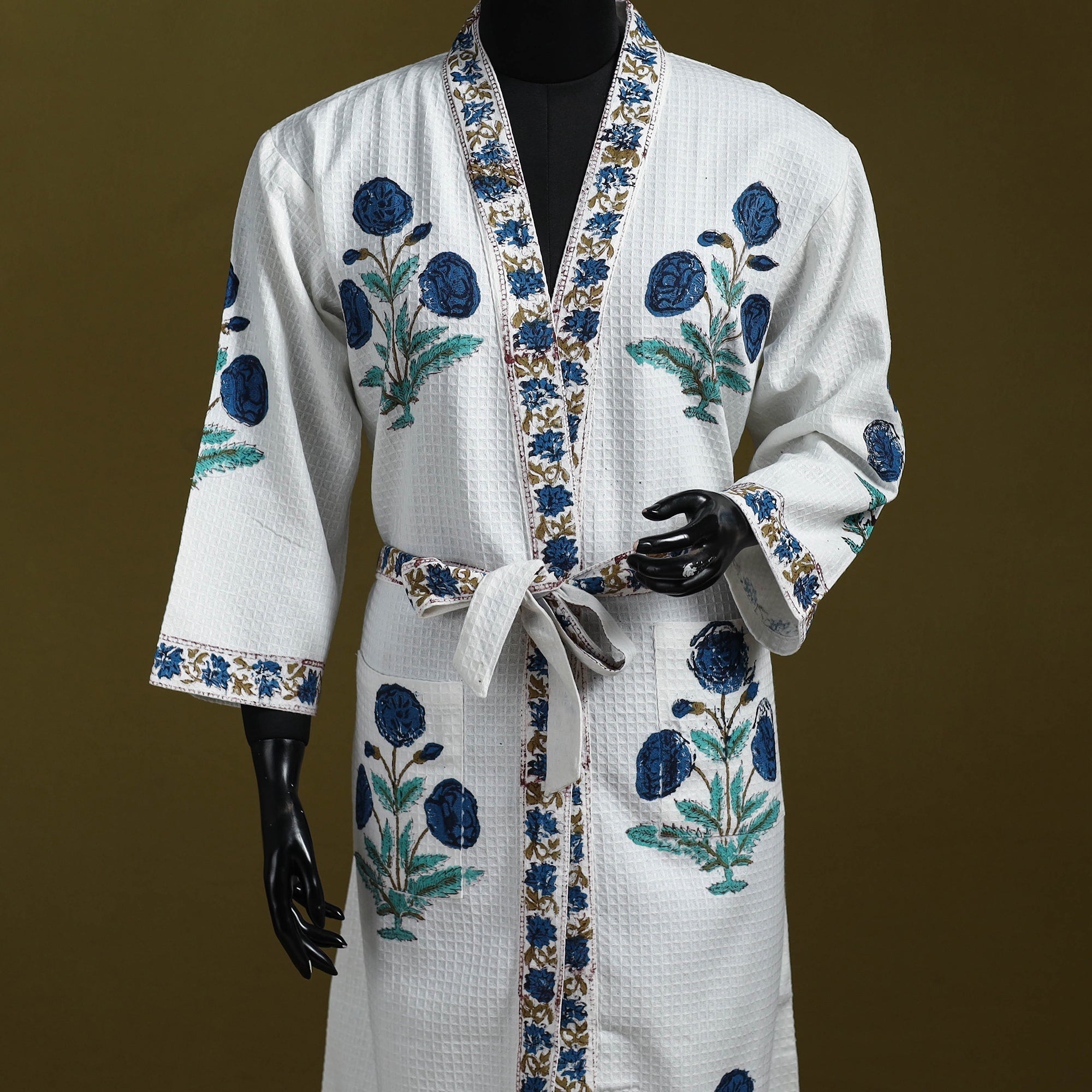 White sanganeri block print waffle weave bath robe is crafted in Rajasthan by artisans Ashok Kumar Chhipa and Lalit Kishore Chhipa using handwoven cotton with a 6-shaft weave for better absorbency. It features vibrant VAT-dyed prints two side pockets for convenience and a separate belt for a comfortable fit. Lightweight breathable and easy to wear it is ideal for showers, spa days or relaxing mornings.