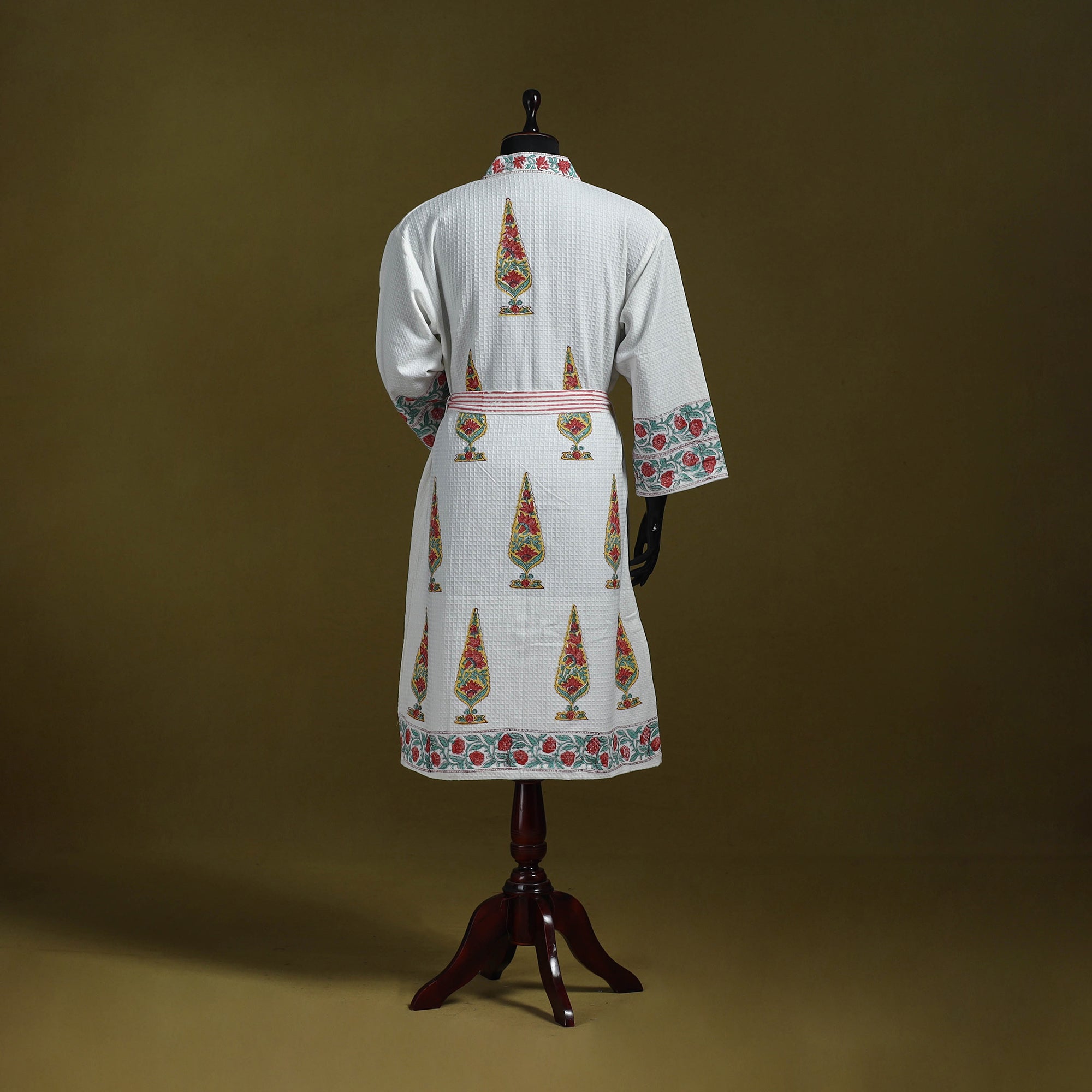 White sanganeri block print waffle weave bath robe is crafted in Rajasthan by artisans Ashok Kumar Chhipa and Lalit Kishore Chhipa using handwoven cotton with a 6-shaft weave for better absorbency. It features vibrant VAT-dyed prints two side pockets for convenience and a separate belt for a comfortable fit. Lightweight breathable and easy to wear it is ideal for showers, spa days or relaxing mornings.