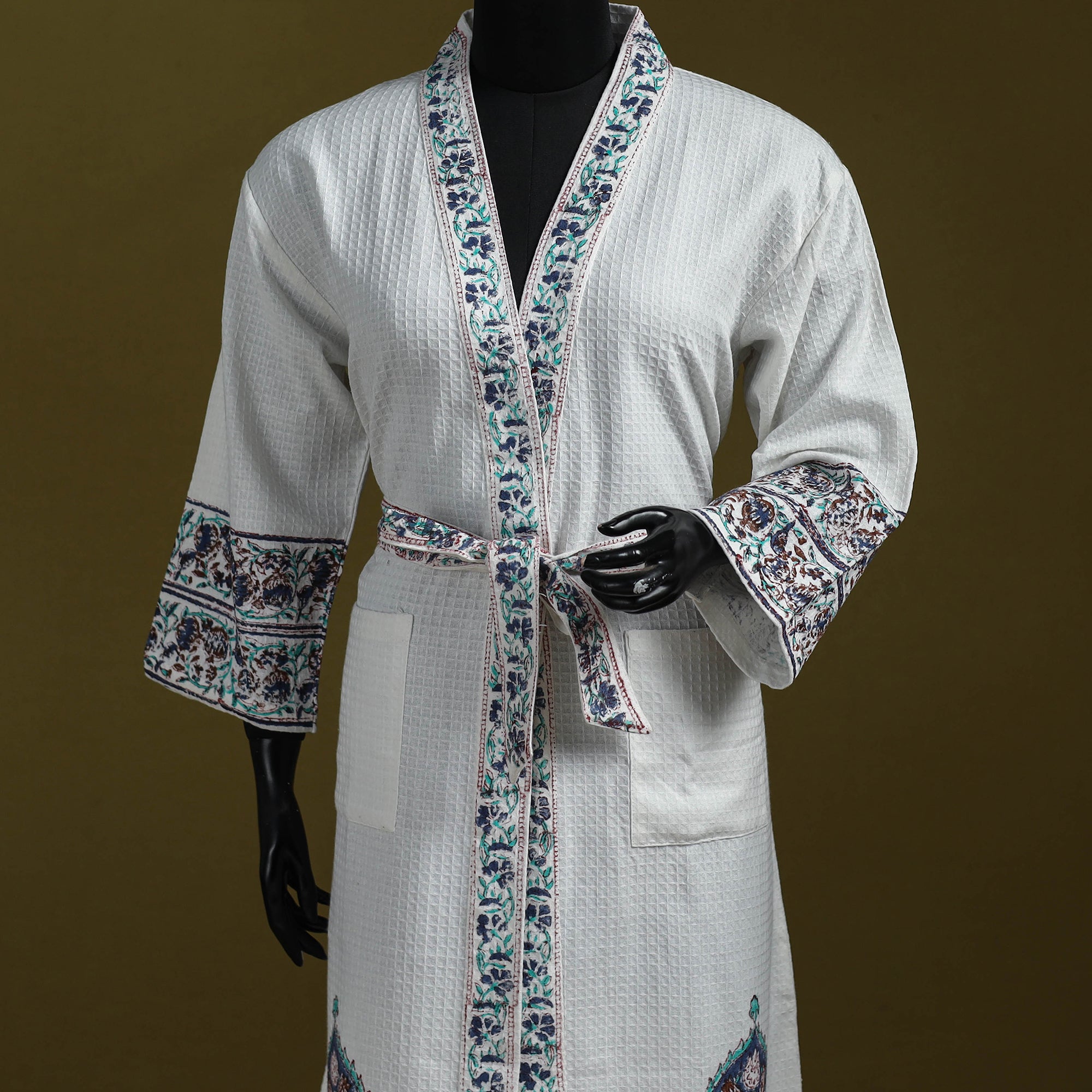 Sanganeri Block Print Waffle Weave Handwoven Bath Robe 13