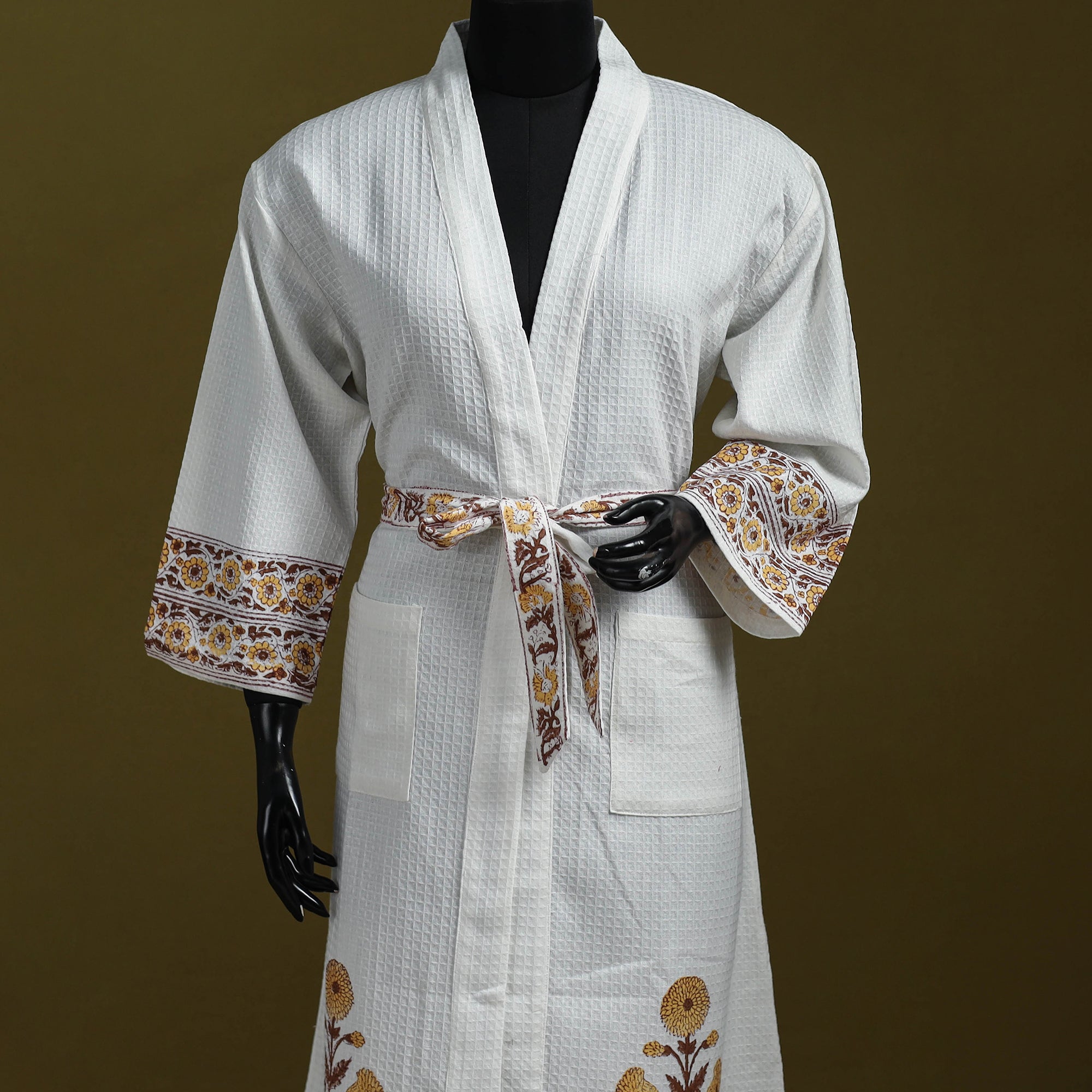White - Sanganeri Block Print Waffle Weave Handwoven Bath Robe 18